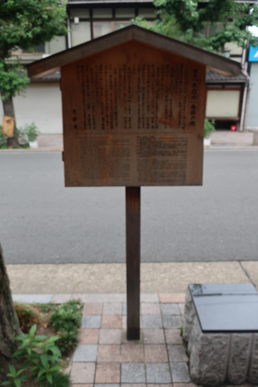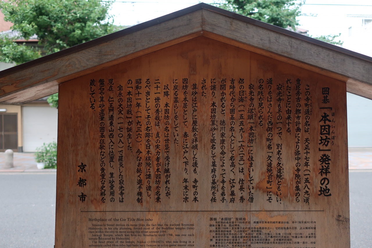 寺町通りを丸太町通りから下って行くと左の歩道に本因坊発祥の地の立て札があります。