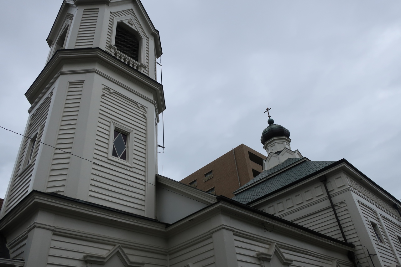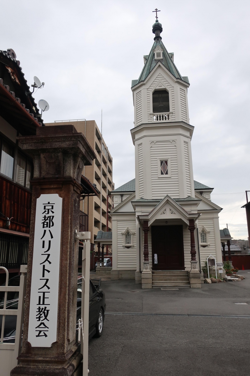 柳馬場通りの夷川通から下った東側に京都ハリストス正教会があります。建物の前は広い駐車場になっており、ちょっと変な感じです。明治34年に建てられた木造の教会は八角塔とドーム屋根が特徴のロシア・ビザンチン様式の白い教会。内部は見られませんでしたが、ギリシャ正教の教会で、30枚のイコンが壁面を飾っているそうです。