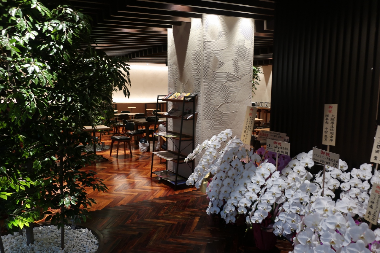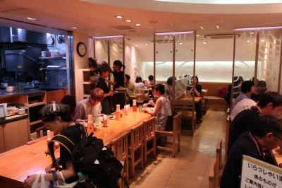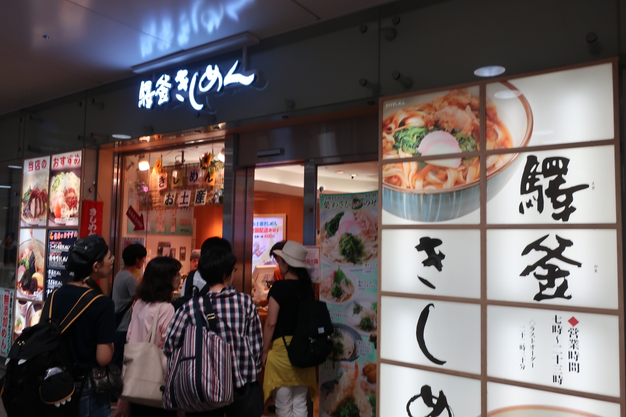 JR名古屋駅の中央コンコースの真ん中辺りにある名古屋名物のきし麺のお店です。入口の左手ではお土産用のきし麺が売られており、土産を買うのに並んでいる人の列がありましが、中でで食べる人は右横を抜けて入店します。手前には一人でも食べられるテーブル、奥に複数人で食べられるテーブルがいくつかありますが、さほど広くはありません。