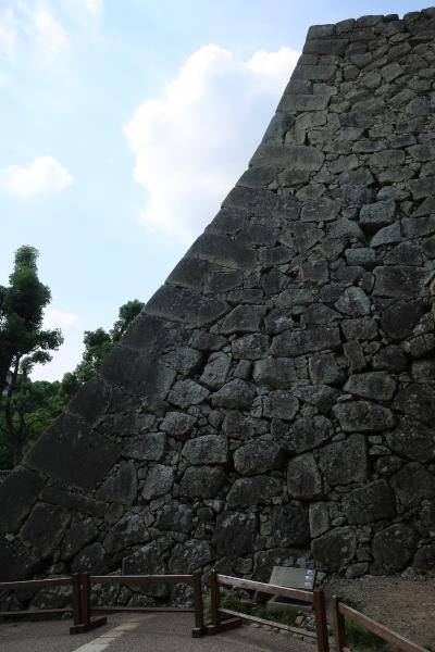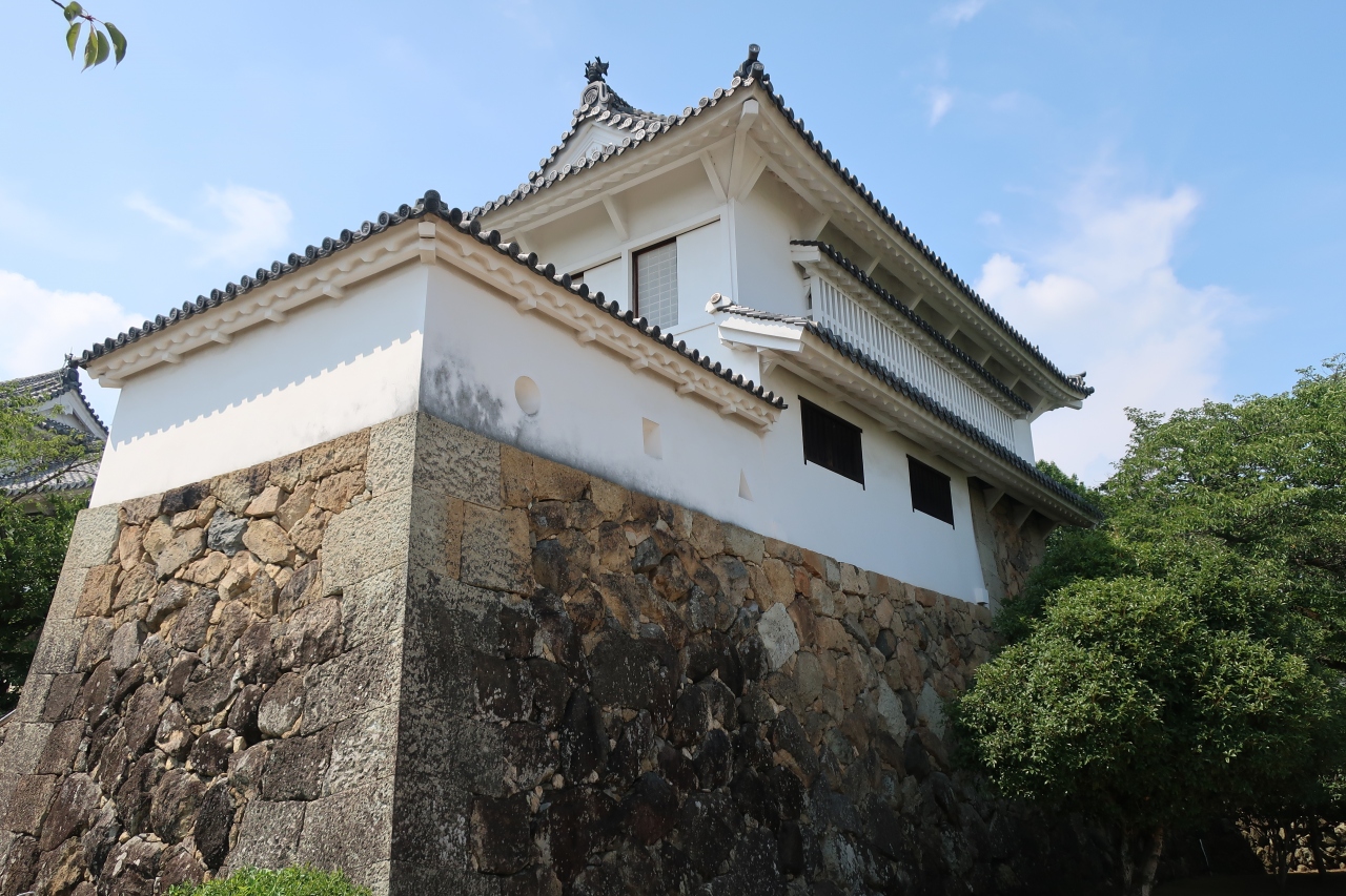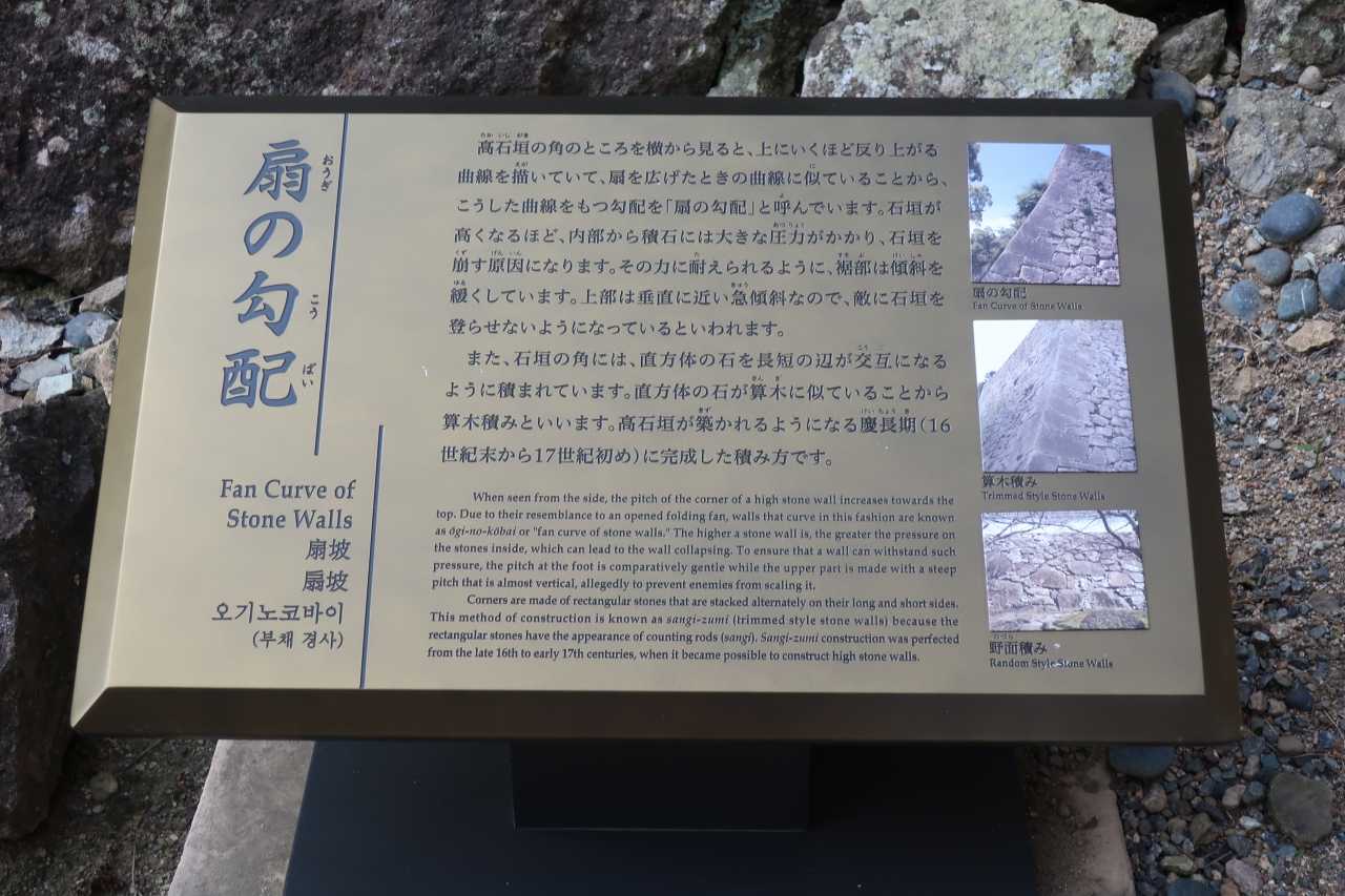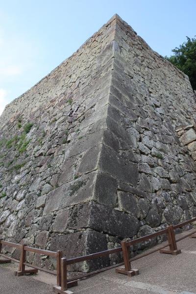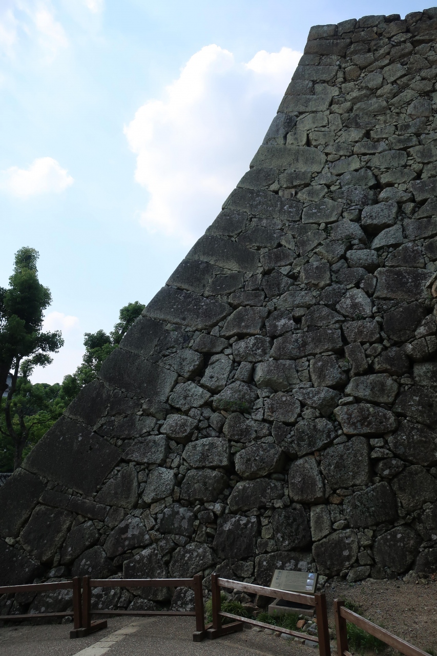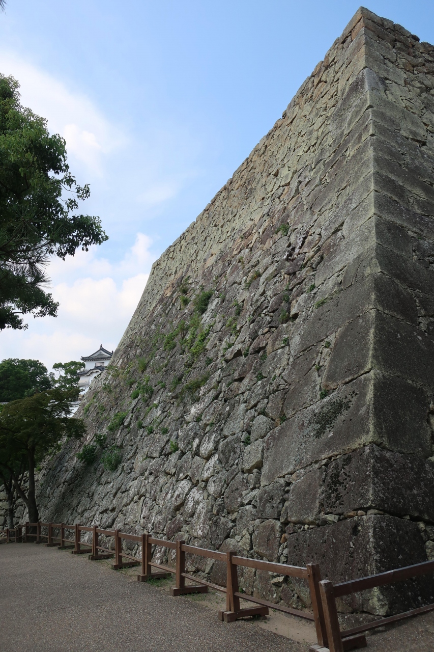 姫路城見学コースの終盤、ぬの門を出た所にある高い石垣が扇の勾配です。門を出てすぐ目の前にある為、通り過ぎてしまう方もいらっしゃいますが、姫路城の中で一番見事な石垣として知らています。備前丸を構成する石垣は黒田官兵衛が作った石垣とは違い、角には算木積と言われる互い違いに石を組んだ手法で築かれ、勾配の反りの曲線が見事。しっかりとみて頂きたい石垣です。