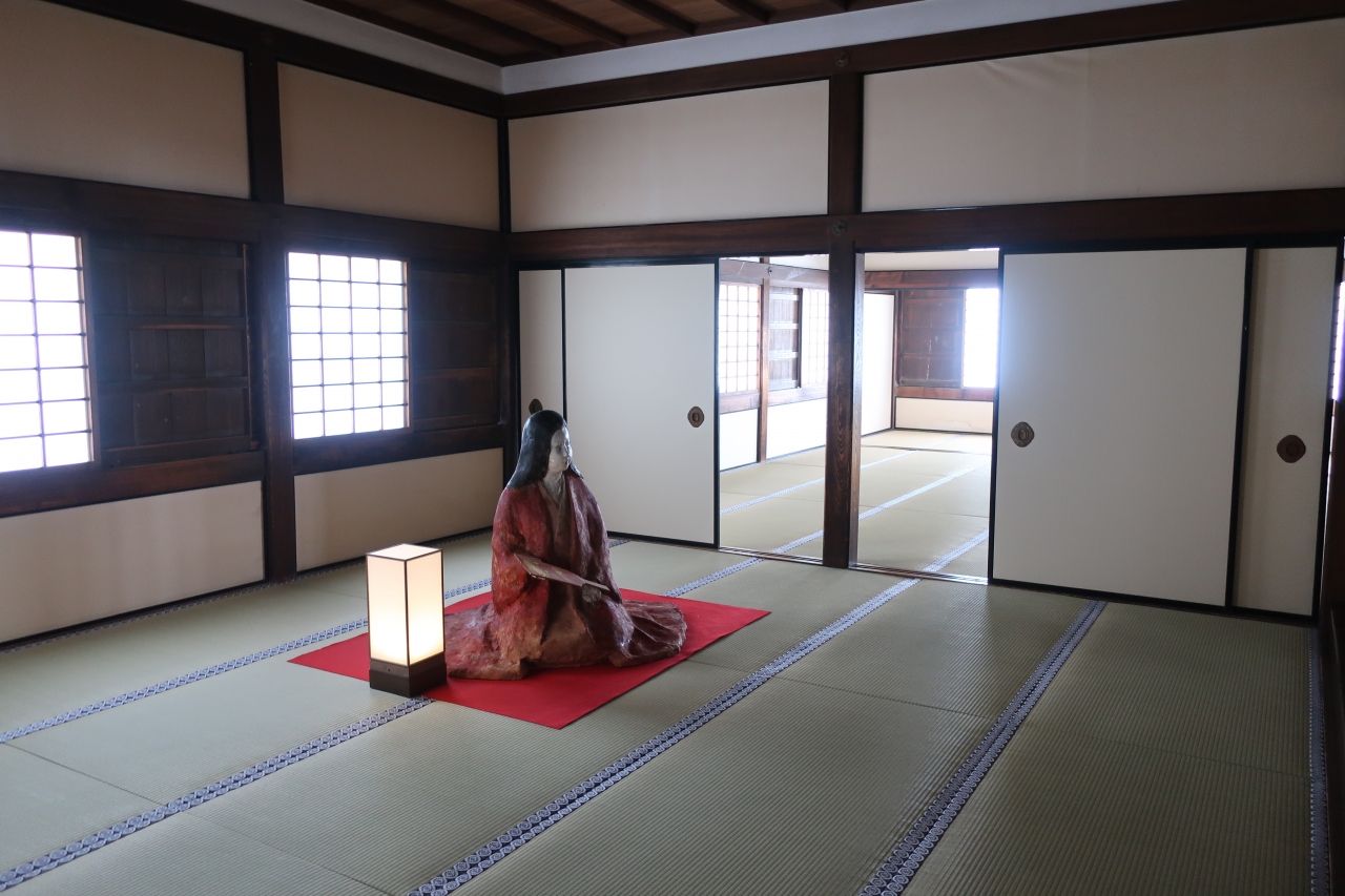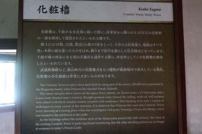 姫路城の西の丸長局、通称百軒廊下の終わりに重要文化財の化粧櫓があります。徳川秀忠の娘 千姫が本多忠刻に嫁いだ際に暮らした場所が西の丸で、化粧櫓は防御的要素よりも居住空間としての畳の敷かれ、壁紙が貼られた室があります。他のお城で、この様な櫓は見たことがありません。化粧櫓には人形が置かれ当時の生活が再現された姿が見られます。