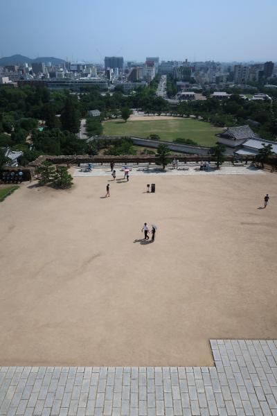 見学コースに沿って姫路城天守を見学後外に出てくると天守石垣の前に広がる大きな広場が備前丸です。大きな木が1本だけ繁るだけの、大きな広場ですが、ここから見上げる天守はとにかく圧巻の迫力です。前景を撮ろうとすると広場の端まで下がらないアングルに収まらない大きさは流石世界遺産。ほんと、戦時中に空襲で焼け落ちなくて良かったと思います。