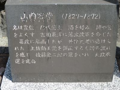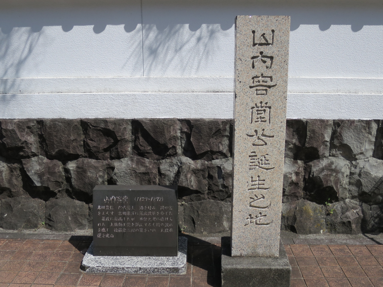 高知城追手門にほど近いひろめ市場の対面、土佐女子校側の追手筋歩道の上に山内容堂公誕生之地碑 が建てられています。幕末期、土佐藩15代藩主として名の知れた殿様ですが、城内ではなく、城に近い城外で生まれたとは全く知らなかったです。しかし、碑と説明板だけですので見ごたえはありません。