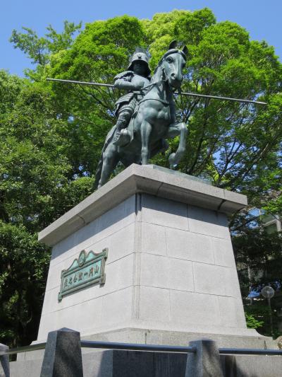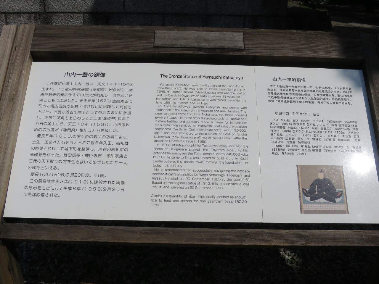 高知城の追手門の手前を右に入った県立文学館の手前に山内一豊像はあります。関ケ原の戦いの功績を認められ土佐の所領を与えられ初代土佐藩主となった人物です。そのためか像は槍を携え騎馬に跨る勇壮な姿をしています。勿論高知城を築城した人物で、今も高知城を守っているようにも見えました。