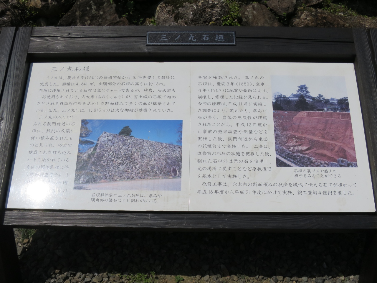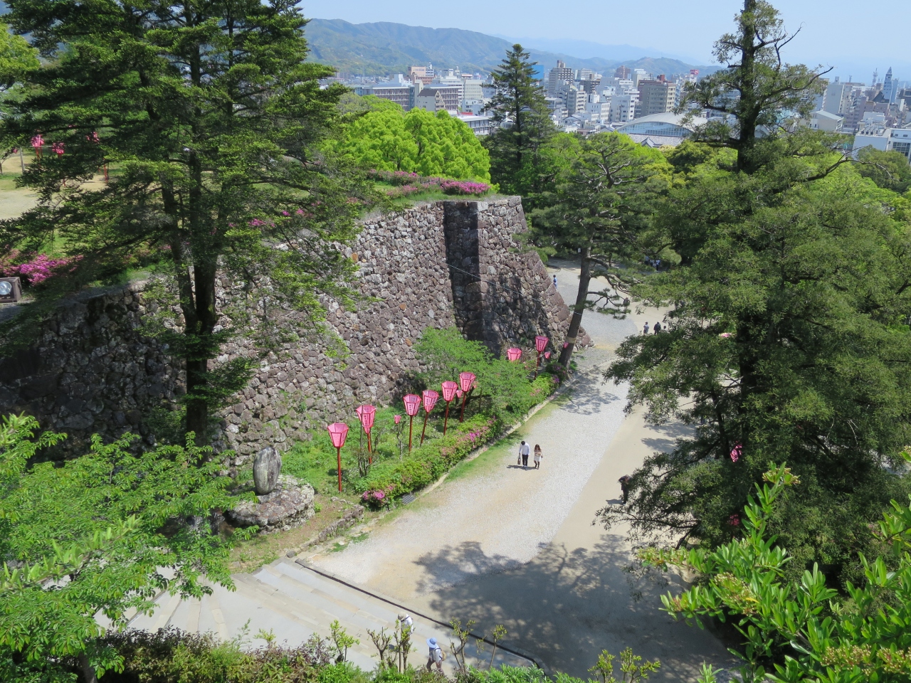 高知城の中腹にある高知城最大の広場です。かつて三の丸には1815平米の壮大な御殿が建てられていたそうですが今はありません。そして三の丸には野面積みの見ごたえのある石垣があります。特に杉の段から見上げる石垣は見事。お城を見学するとき城が建てられた時代や場所により使われている石や積み方が異なるのが見ていて面白いです。