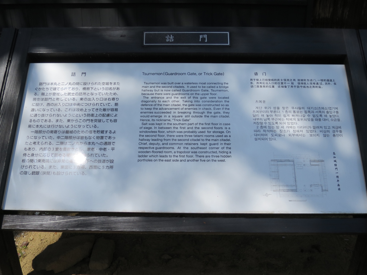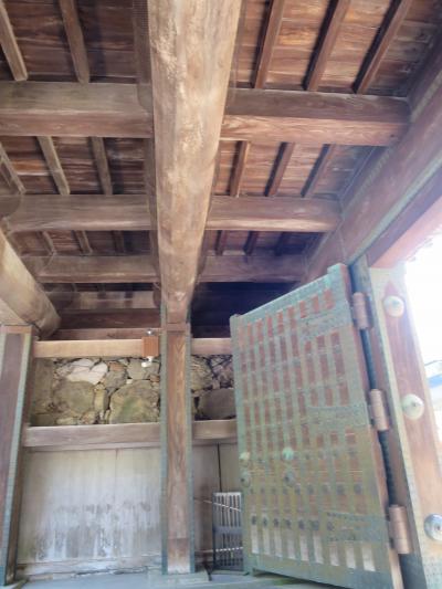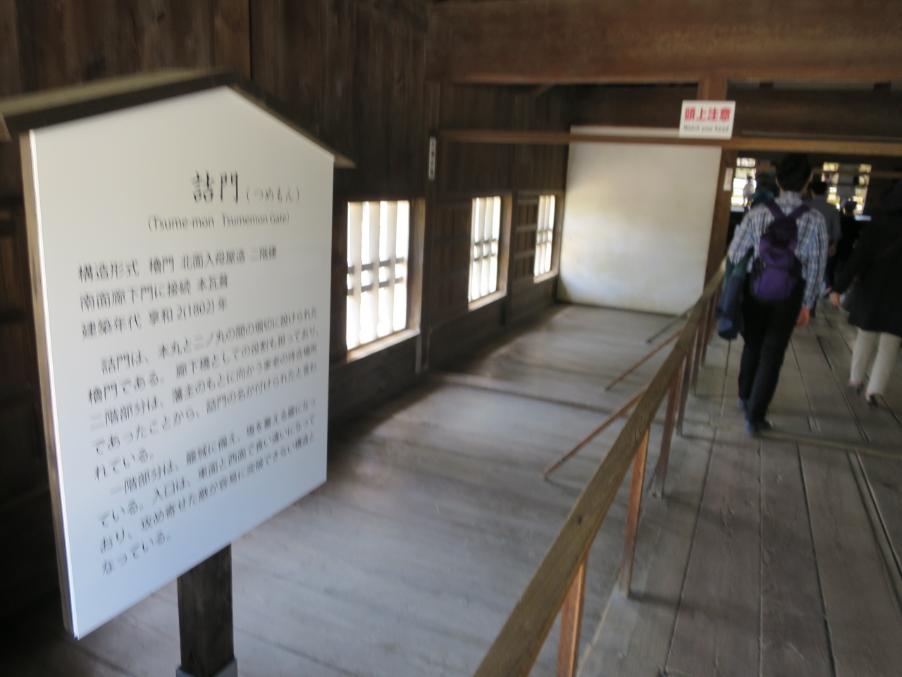 高知城の鉄門跡の石段を上った突き当り正面に詰門があります。本丸と二の丸を跨ぐ詰門は渡り櫓の様な形をしており、門とは言いますが、小さな扉一つしかついていません。実際の所、門と言うよりも武士の詰所や、物置として使われていたそうです。