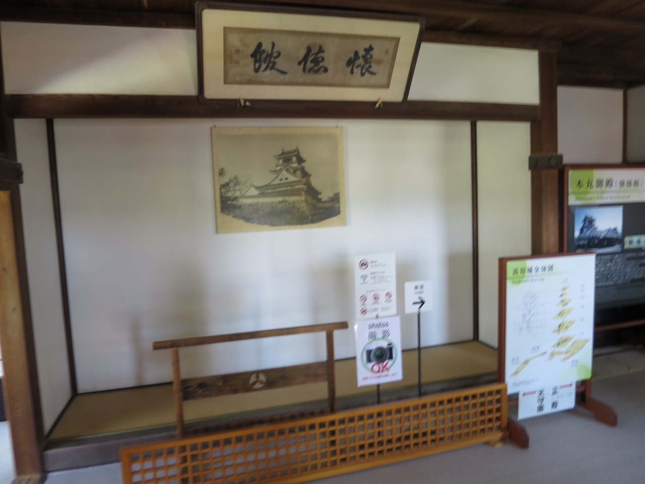高知城 詰門を右から回り込むように上った広場が二ノ丸です。現在は何にもない広い広場ですが、かつては二ノ丸御殿、家具櫓、数寄屋櫓があり広い理由が分かります。ここから詰門2階の渡り廊下を渡り、廊下門を潜って本丸に入れる様になっています。そのため二ノ丸からは詰門、廊下門、天守を一つのアングルに収めて撮影することができます。