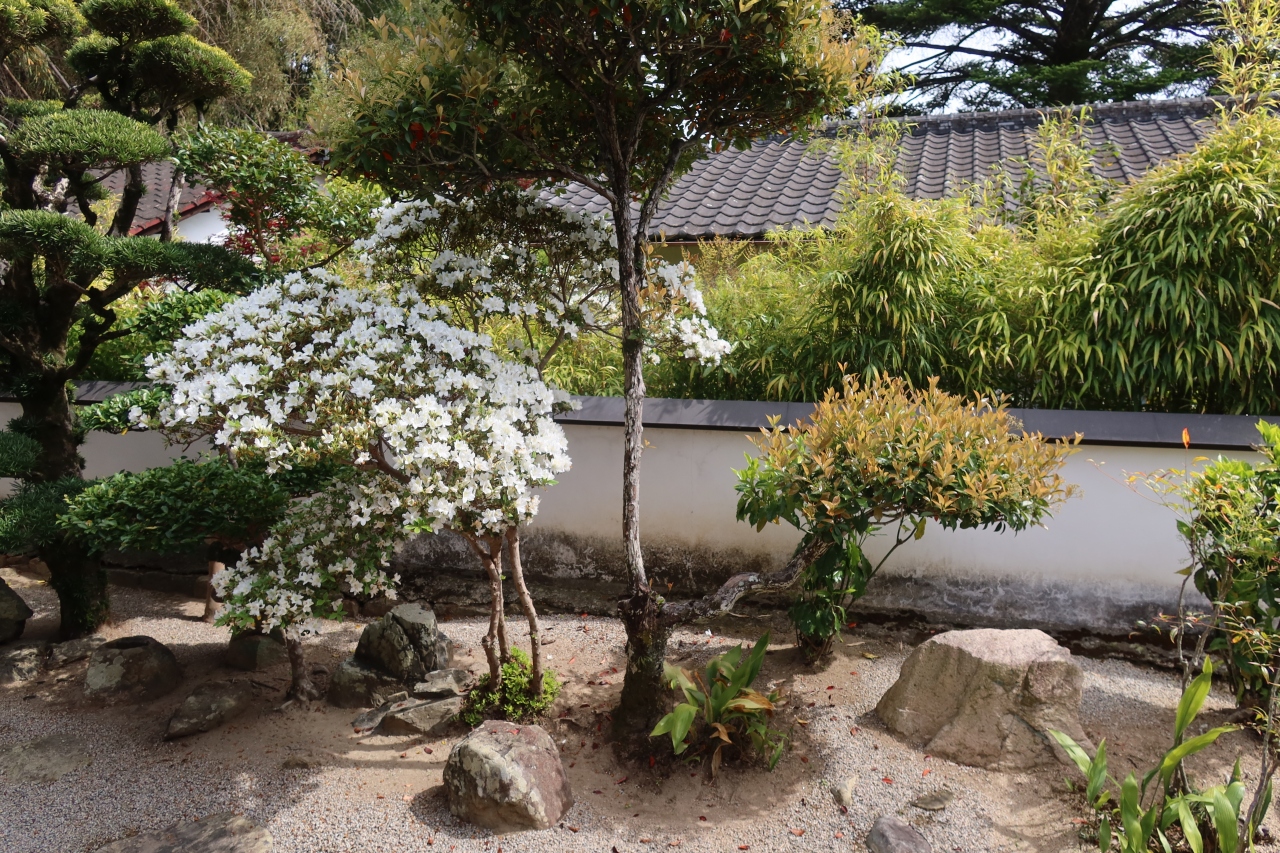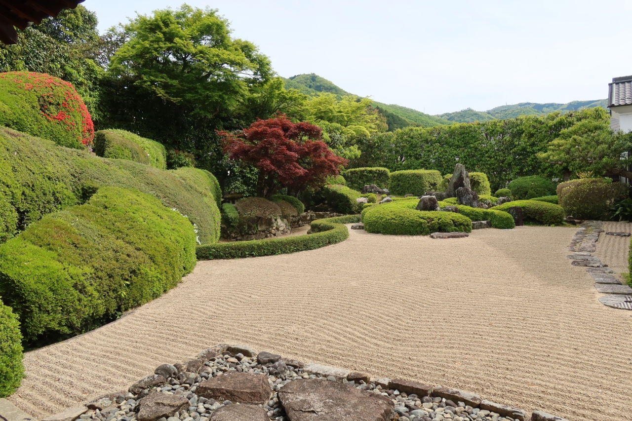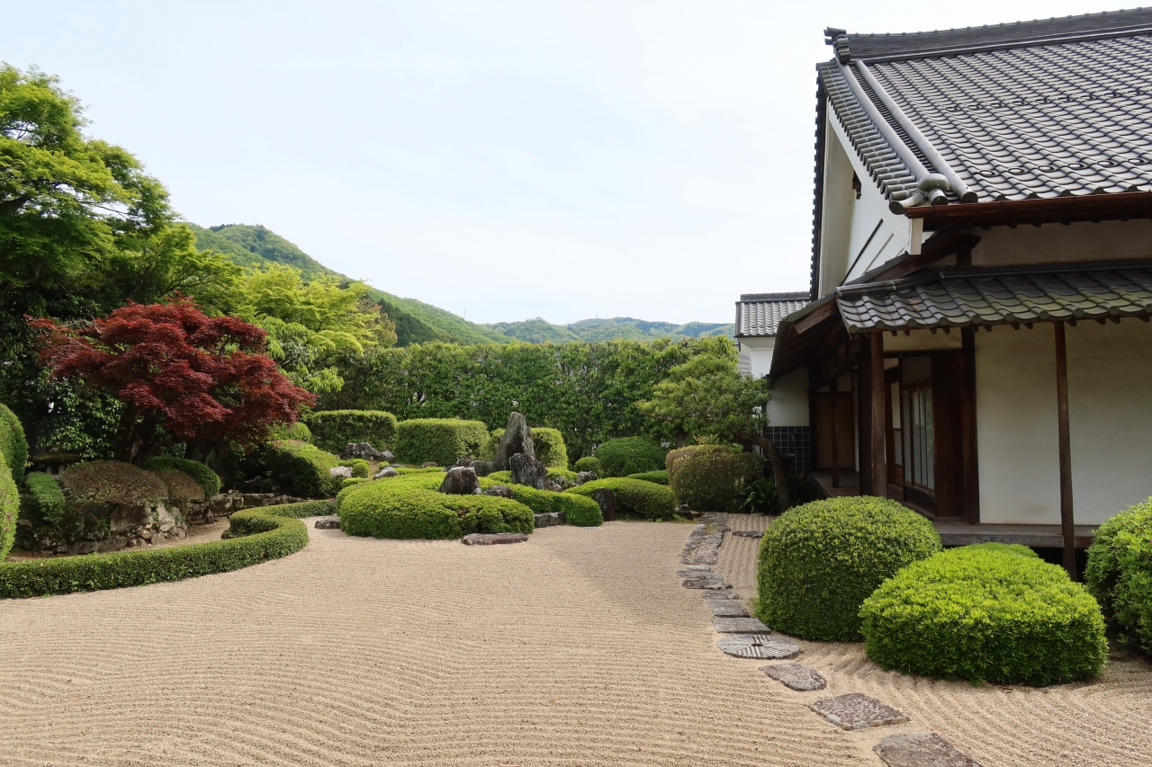 高梁の頼久寺には小堀遠州が初期に築庭した頼久寺庭園があります。鶴と亀を模した枯山水庭園は国指定名勝に指定されています。庭園全面には白砂が敷かれ、敷愛宕山を借景としてサツキの刈り込みが綺麗です。