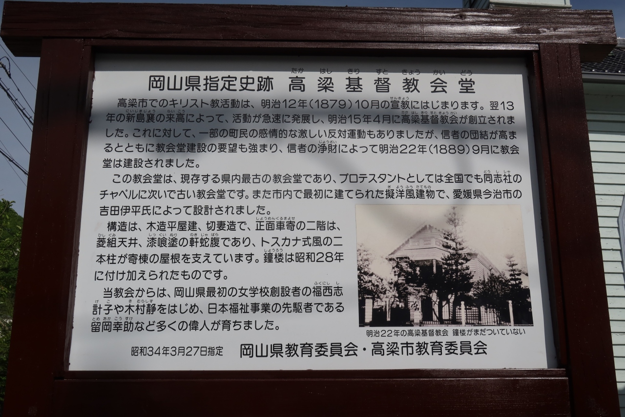 高梁市の中心部を流れる紺屋川沿いに木造の古そうな教会があります。それが高梁基督教会堂です。明治22年の建造された教会は岡山県内では最古の物だそうです。ベランダのある洋風教会建築として見応えがあり、日曜礼拝時以外は内部も見学することが出来ます。