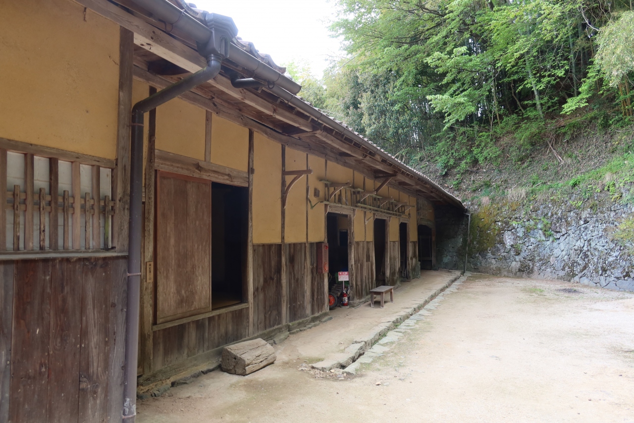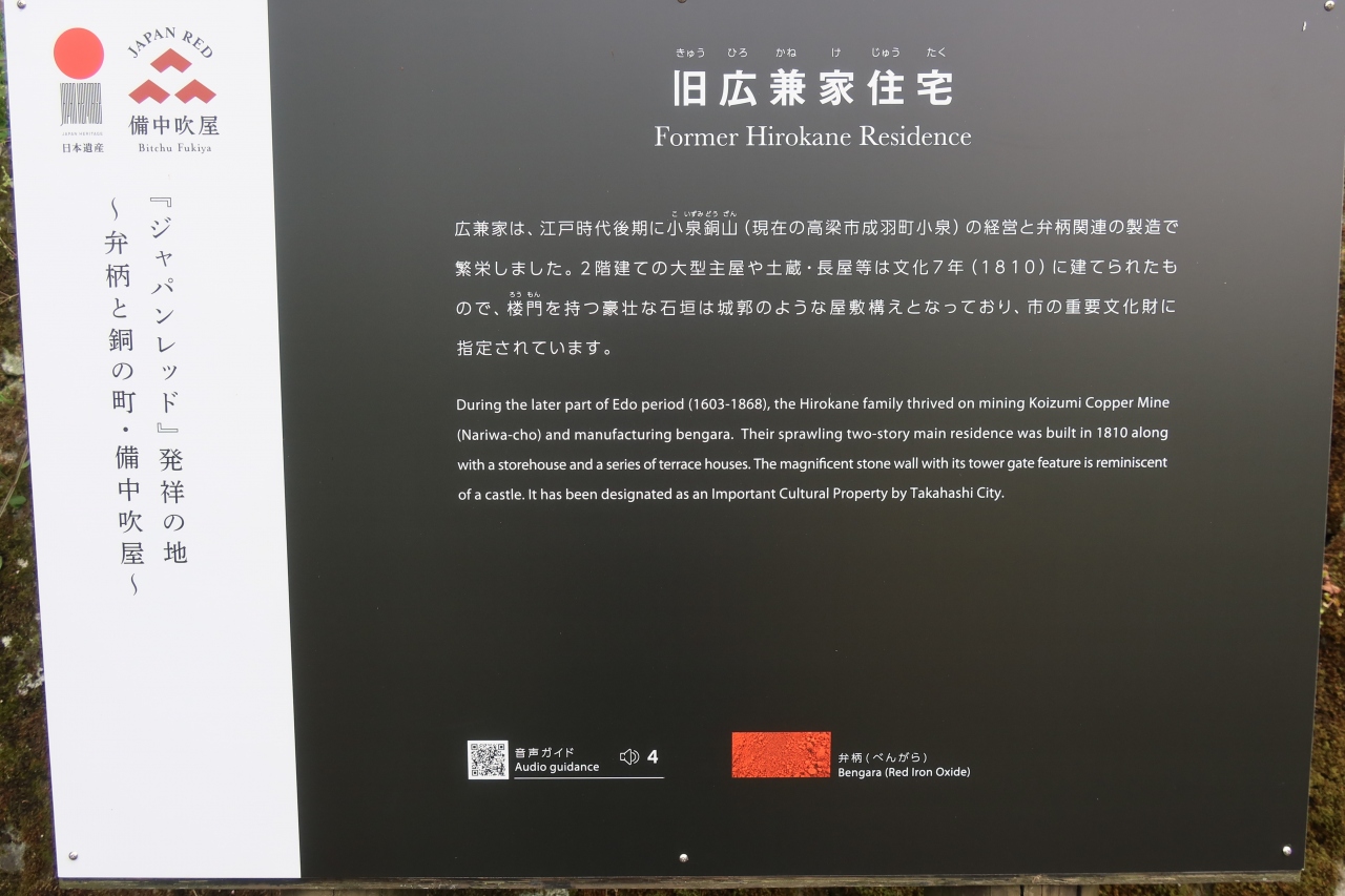 吹屋ふるさと村から南に4km程行った先に広兼邸があります。ベンガラの原材料の製造で財をなした庄屋で、その建物はまるで要塞の様です。映画「八墓村」の多治見家のロケ地にも使われたその姿は、他では見られない程のインパクト。石垣の上に建てられた広兼邸の建物は映画とは違っていましたが、母屋や長屋、土蔵があり豪商であったことが良く分かります。建物の中に上がれないのは残念でしたが、見応えのある邸宅です。