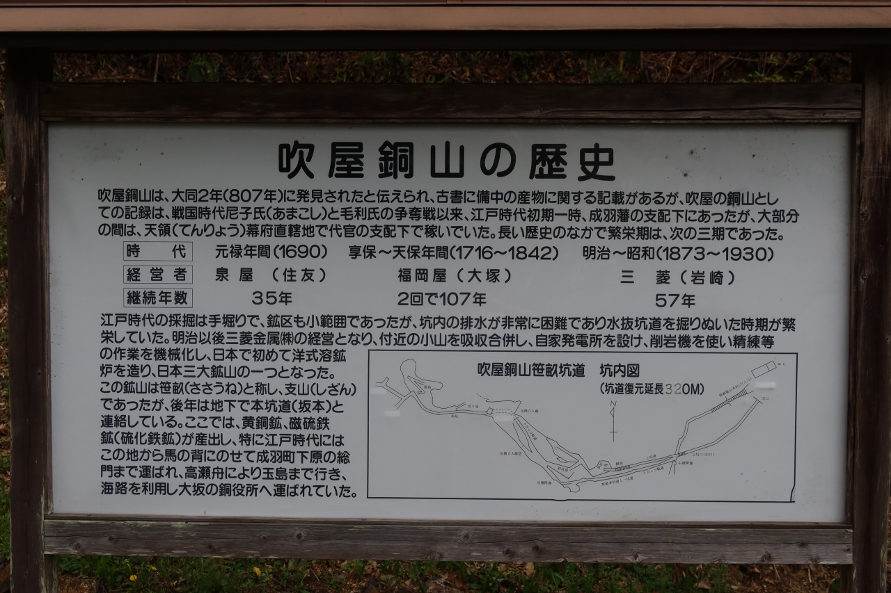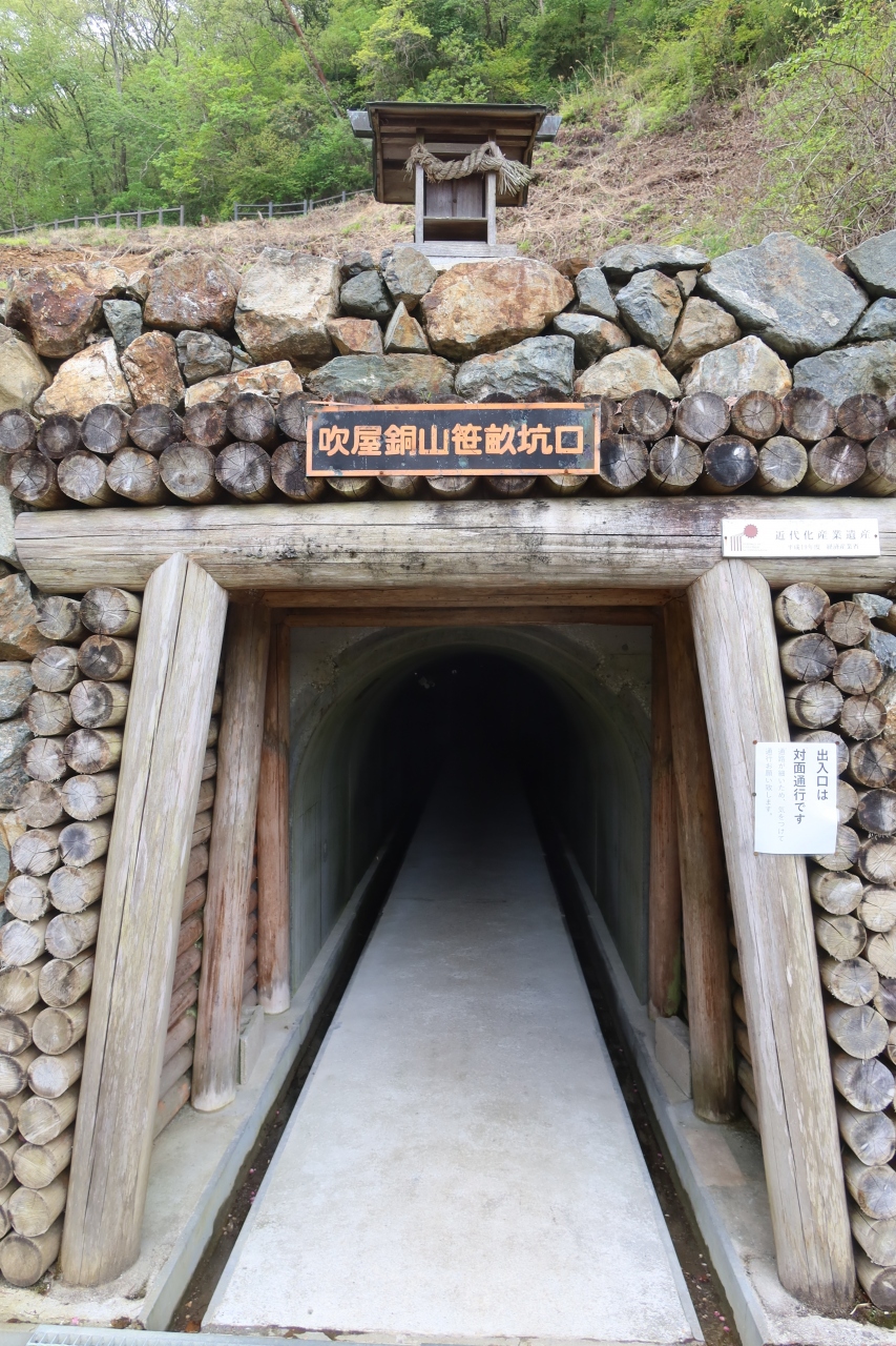 吹屋ふるさと村から南に1km程行った所に笹畝坑道があります。江戸時代から大正時代にかけて黄銅鉱・磁硫鉄鉱を産出していた吉岡銅山の坑道の一部です。中に入るとひんやりしており、採掘の姿が人形で再現されいます。べんがらで栄えた吹屋の基となった坑道は、鍾乳洞とは違いちょっと面白いです。