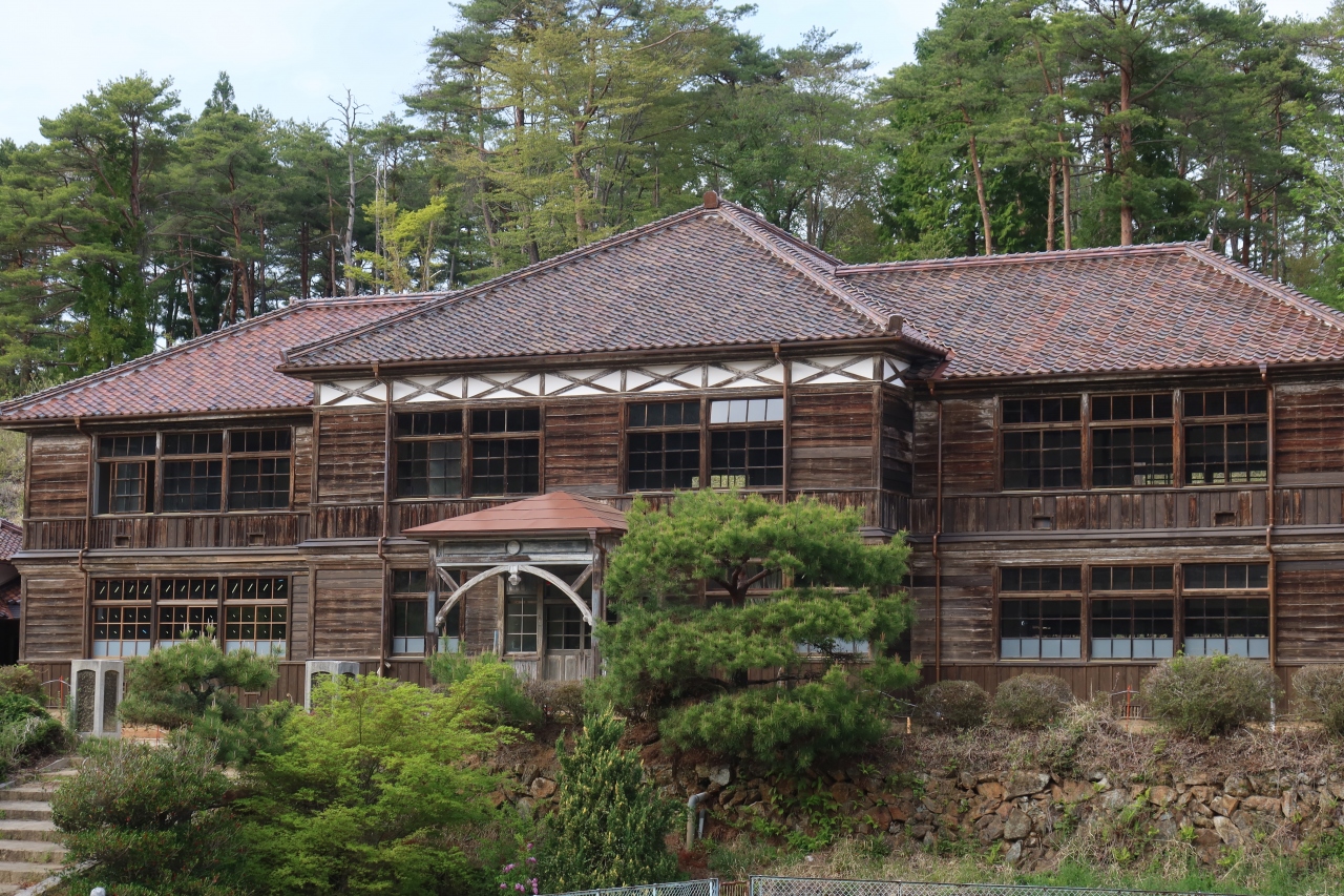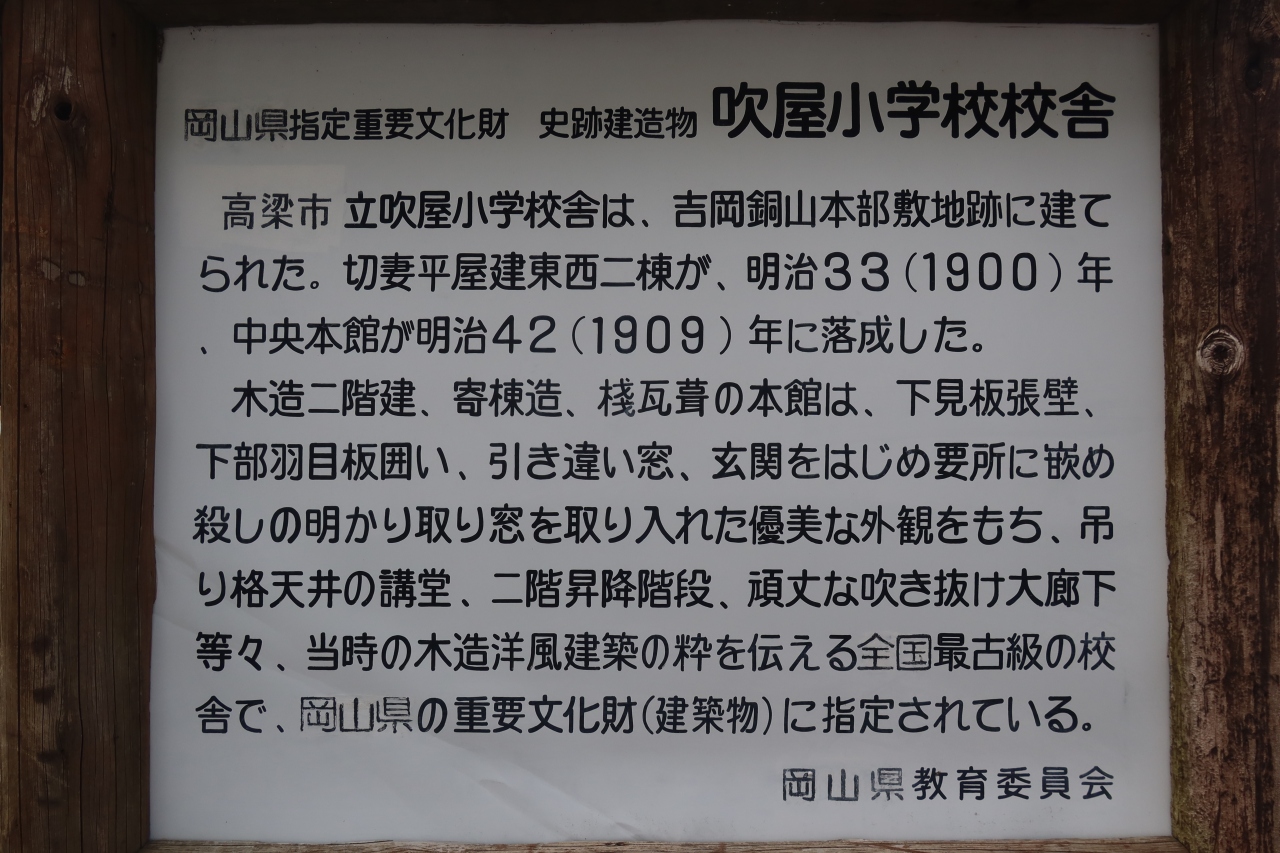 吹屋ふるさと村の中程から山に入った所に旧吹屋小学校があります。明治6年に拡智小学校として開校した学校の本館は明治42年に建てられた木造校舎です。映画に出て来るような校舎ですが、現在は修復修理中で外からの見学しかできません。