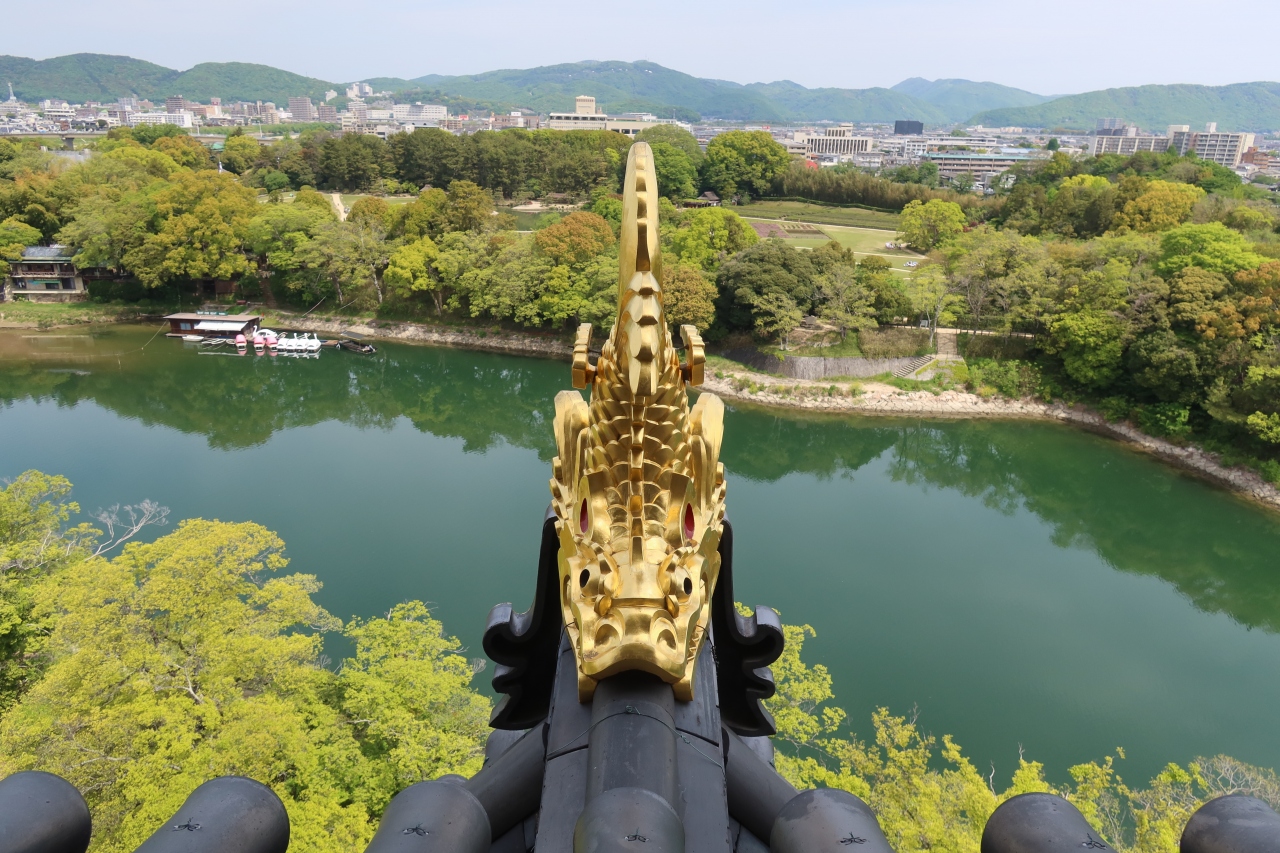 旭川を挟んで岡山後楽園の対面に岡山城があります。宇喜多秀家が築城した城で黒い外装から別名烏城とも呼ばれています。現在の天守は太平洋戦争で焼失し再建されたものです。五角形の天守台の天守は見る角度によって、雰囲気が異なります。私は月見橋辺りから見る岡山城天守の姿が一番だと思います。
