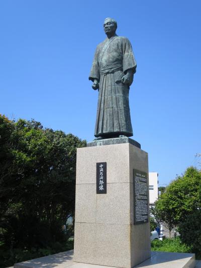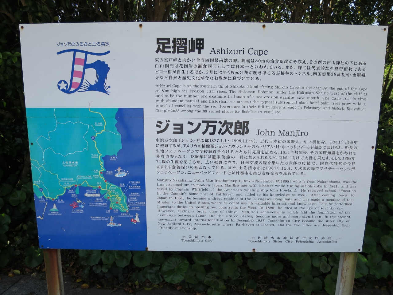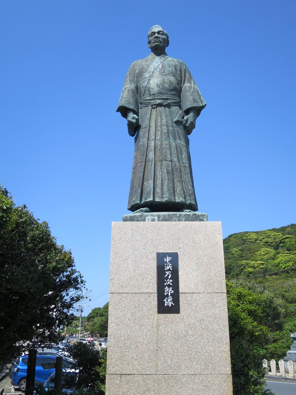足摺岬にある金剛福寺前にある駐車場の横、観光案内所の前の遊歩道入り口広場に中浜万次郎像があります。ジョン万次郎として誰もがしる人がこの土佐清水の漁師であったことを、この像を見て思い出しました。しかし、名前の由来となっている土佐清水の中ノ浜出身で足摺とは直接関係はないんで、なんでこんな所に建てたんだろう?商売?と思ったの私だけでしょうか。