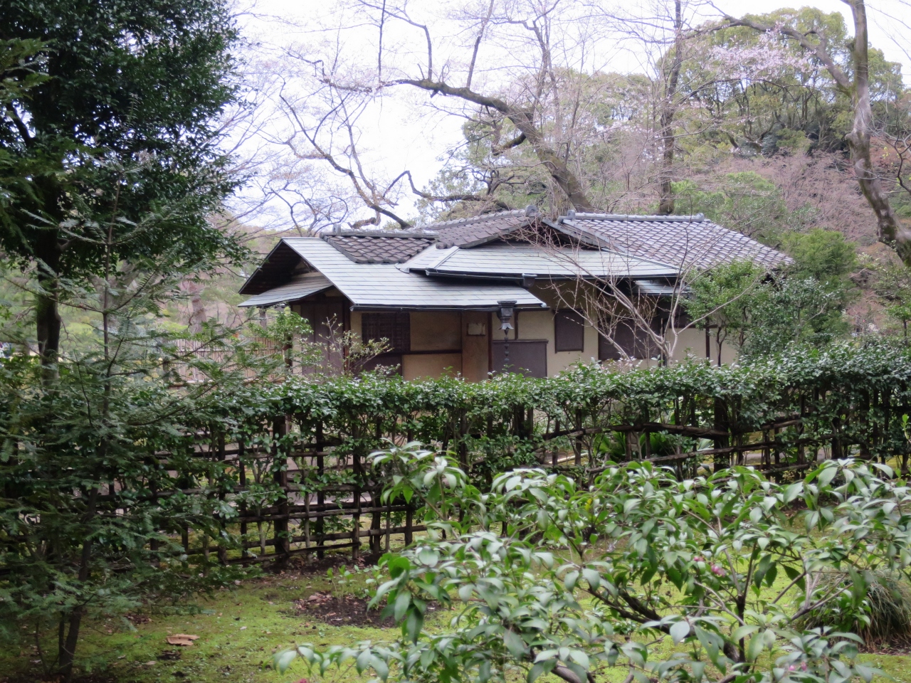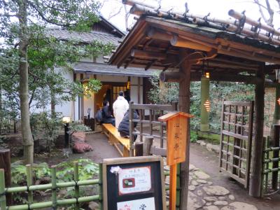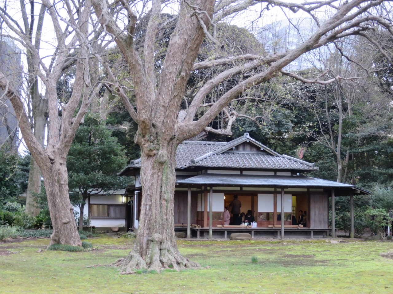 六義園の玉藻の磯の後ろ側に池を望むように心泉亭があります。通常は有料の集会所としてしか入れませんが、桜の開花時だったので有料のお茶席となってます。抹茶に和菓子が付いて510円。夕刻前にも関わらず10人程の待ち行列。15人程しか入れないので待たされるのも納得。庭園を見ながら頂く抹茶はおつなものです。