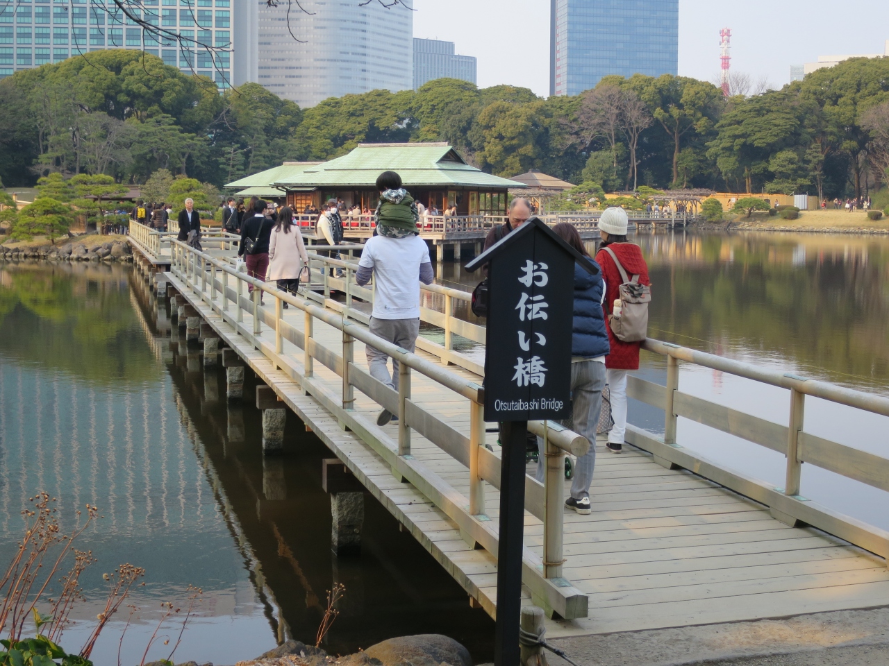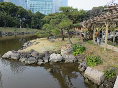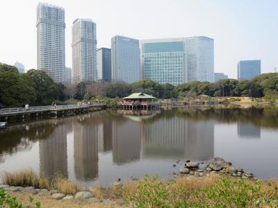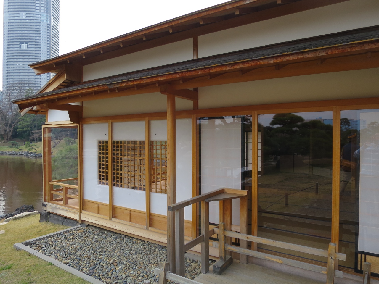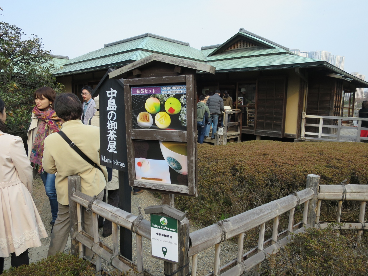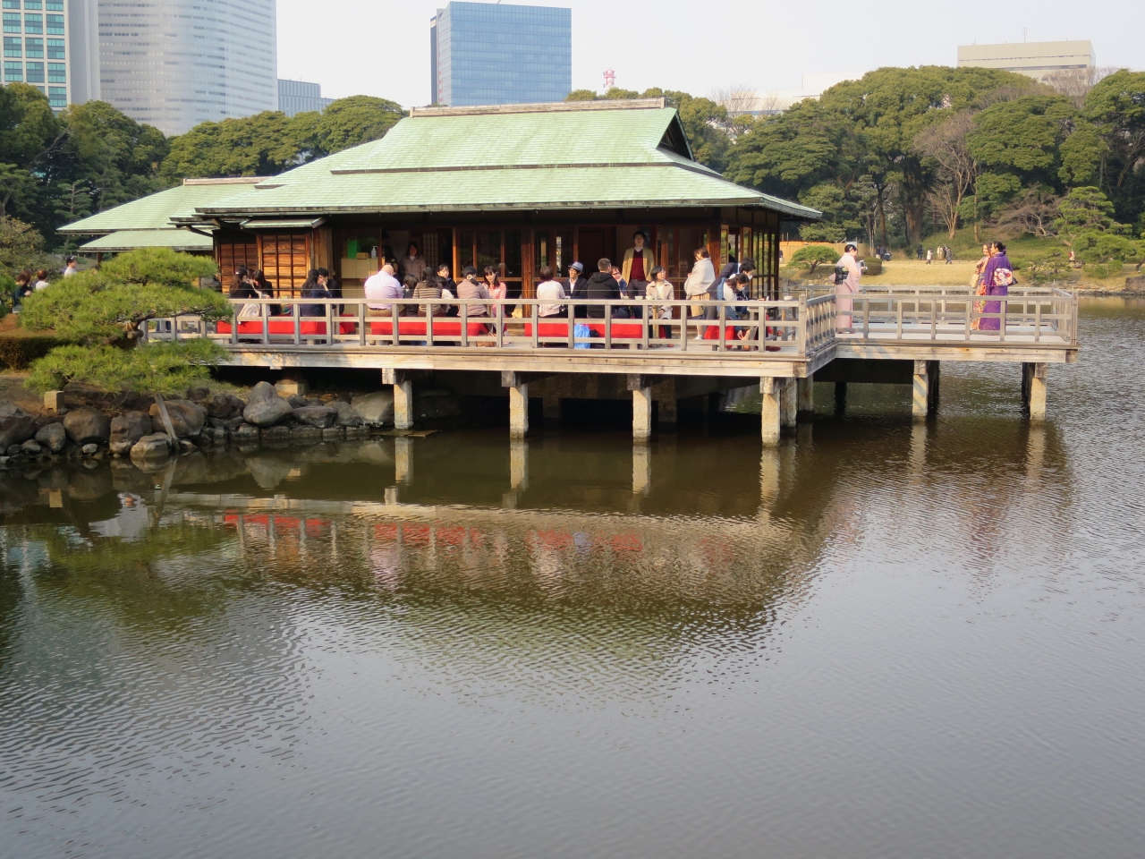 浜離宮恩賜庭園一の名所 潮入の池に浮かぶ中島に建てられたお茶屋です。現在の建物は再現されたものですが、休憩所となっており抹茶、和菓子のセットを頂くことができます。しかしとても混んでおり、お伝い橋まで並ぶほどなのでお茶はしませんでしたが、自由に中に入って見学することができます。浜離宮の茶屋では唯一ここだけです。池に面してテラスの様になっており、そこから潮入の池を一面に見渡せます。