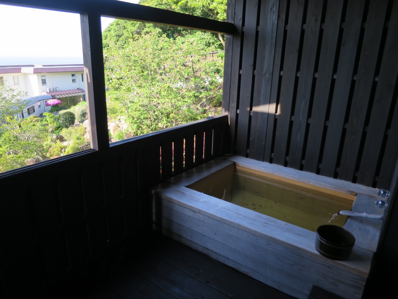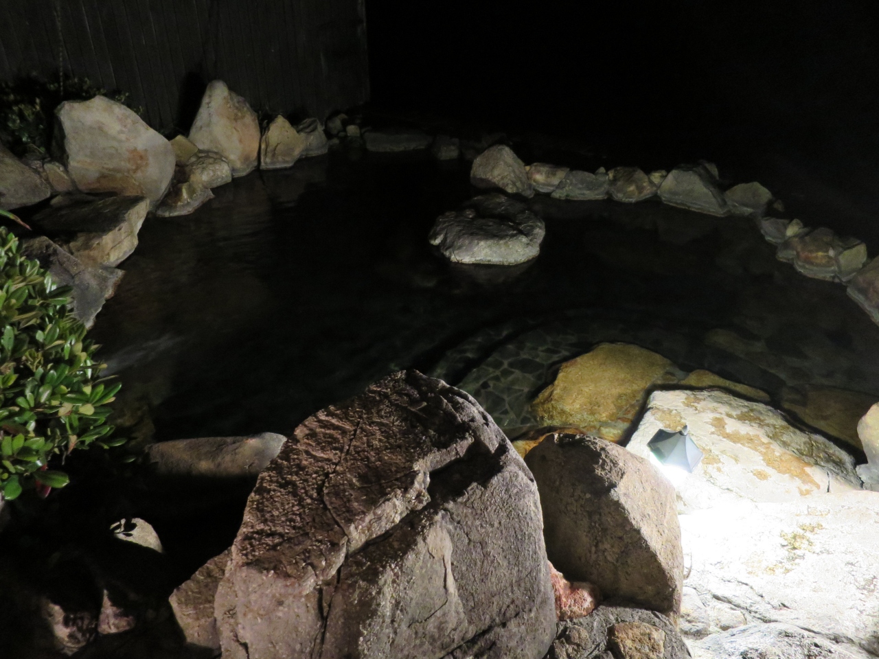 部屋は二間で窓からは露天風呂が丸見え。客室の掃除はあんまり行き届いてなく蜘蛛の巣が張っていたところもありました。露天風呂は広いですが、浸かると前面に広がる海は見られません。その代わり夜は満天の星空を見ながら浸かることができるのは良かったです。