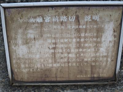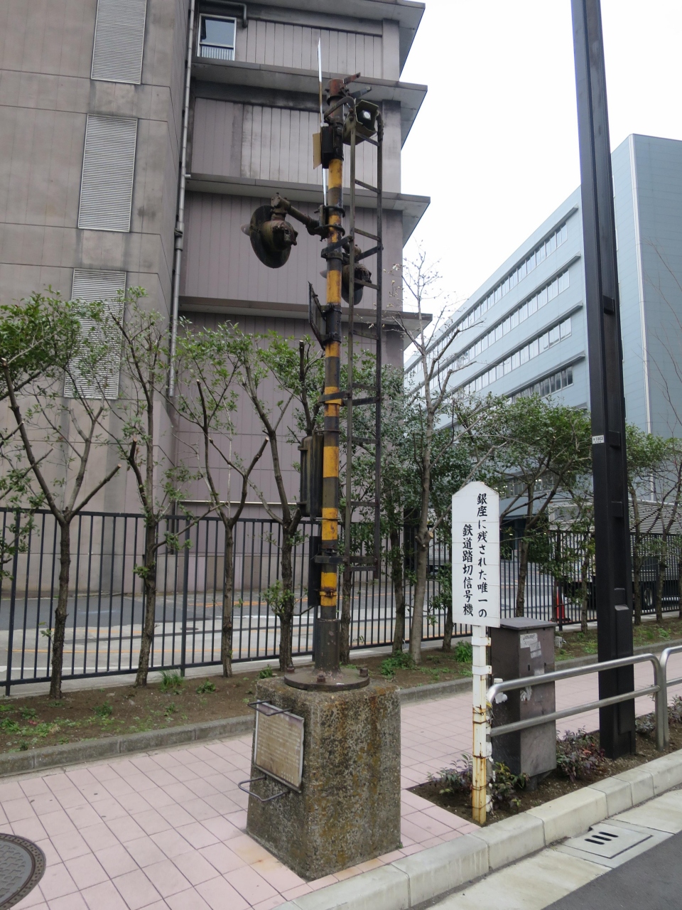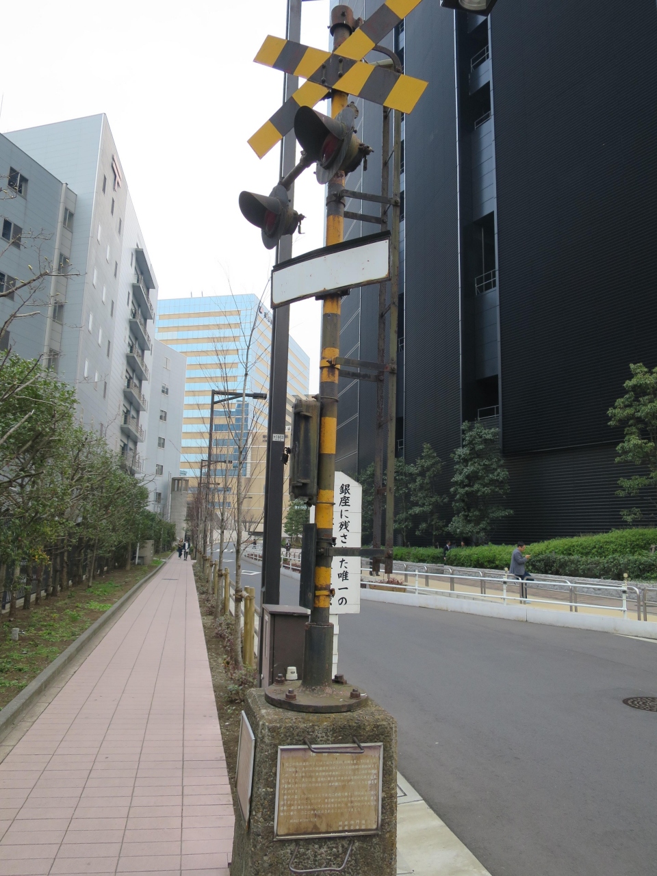 浜離宮から銀座方面に歩いていくと銀座8丁目付近の道路脇に踏切にある警報器がポツンと立っています。線路もないのになんでこんなところにあるのかと思い近づいてみると「銀座に残された唯一の鉄道踏切信号機」の看板がありました。今は道路になっているところに市場への引き込み線があったようです。