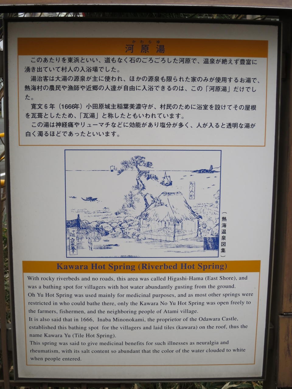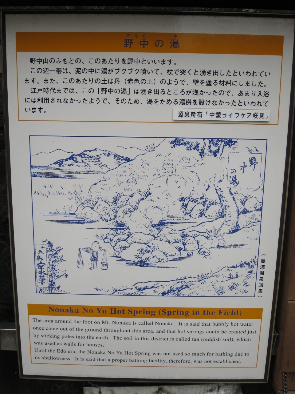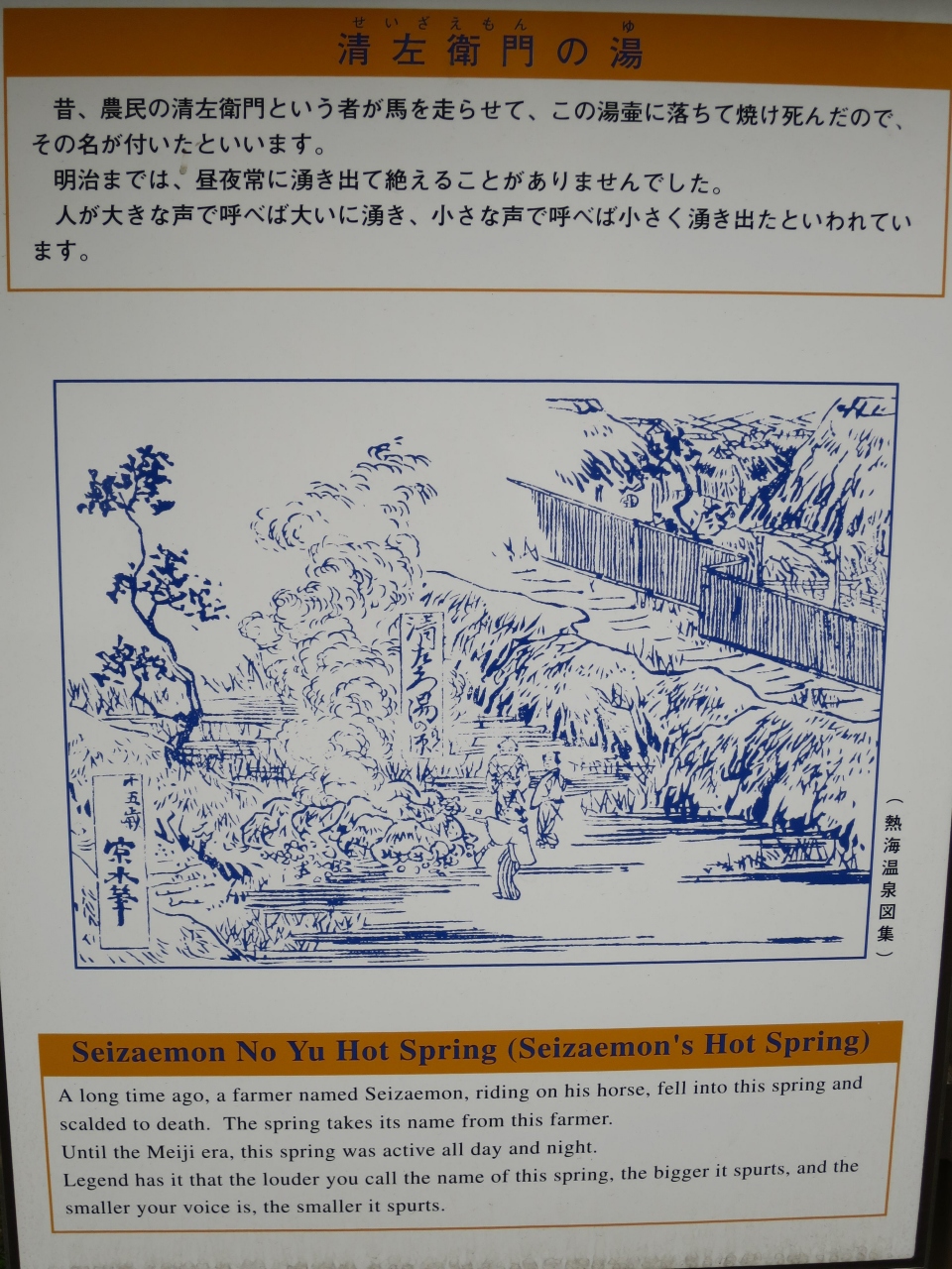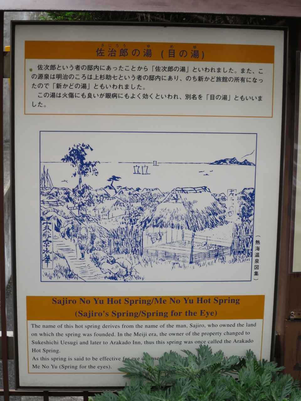 熱海銀座にある熱海七湯の一つに数えられる源泉です。駐車場左前の道路脇に花壇の様な所に湧出しています。佐治郎の邸宅にあったことから佐治郎の湯と云われ、目の病に効くことから目の湯とも呼ばれています。源泉と言うと熱そうですが、手を付けてみると、意外とぬるく、ほんとに源泉?と思う程でした。目薬には丁度良いかも。