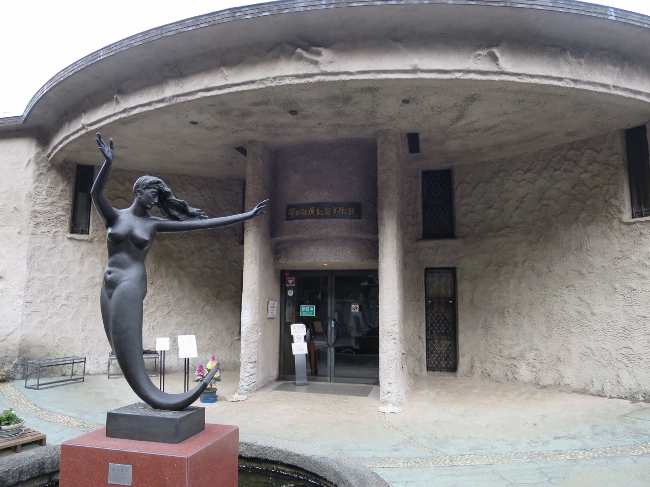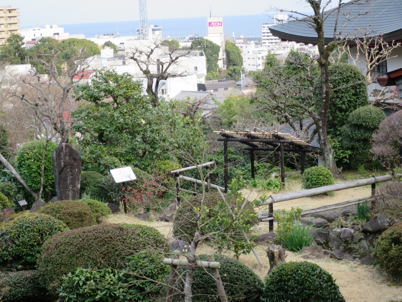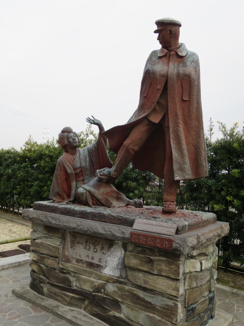 熱海の国道153号線沿い、サンビーチの近くのお宮緑地の中に、尾崎紅葉の小説「金色夜叉」に因んで、お宮の松と「貫一 お宮の像」が建てられています。お宮の松は大きいですが、実は二代目の松。「貫一 お宮の像」の像は貫一がお宮を足蹴にするシーンが像となっており、今の時代じゃ考えられない男尊女卑を表しているようにも見えます。名シーンとは言え知らない人から見ると不快かもしれません。