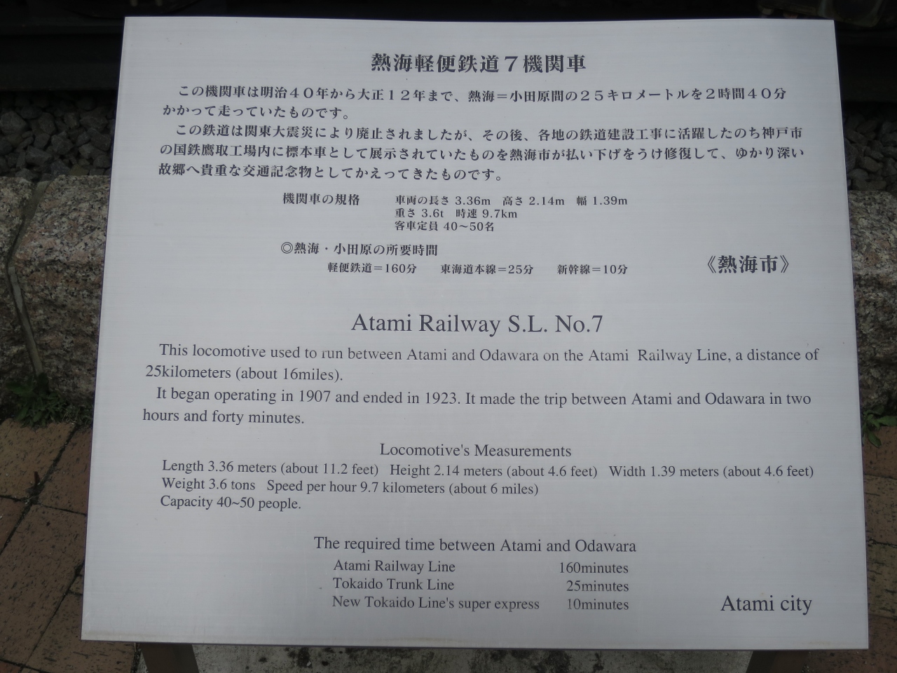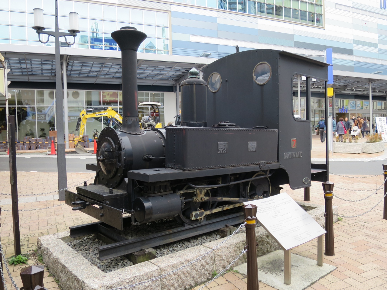 熱海駅前ロータリー西側の歩道上、仲見世通り入口前に小さな蒸気機関車が展示されています。これが熱海軽便鉄道機関車です。国鉄が開業する前に小田原と熱海間25kmを2時間40分で結んでいた記念すべき鉄道遺産です。普通の蒸気機関車はとても大きいですが、この機関車はちょっと大きな車程の大きさ。とても可愛い機関車です。