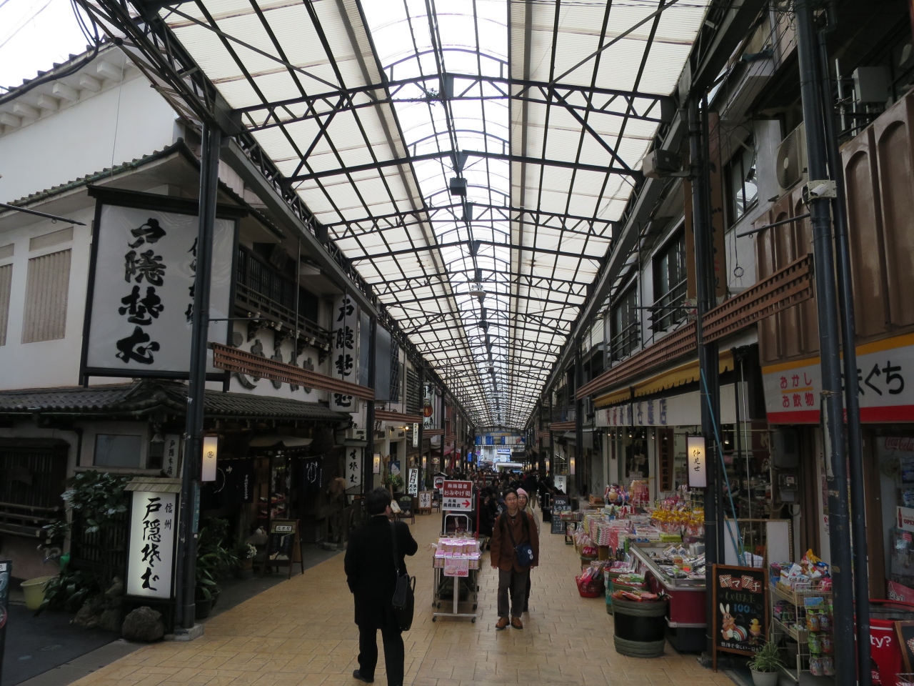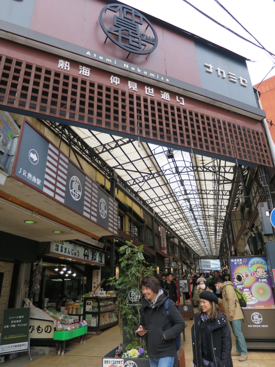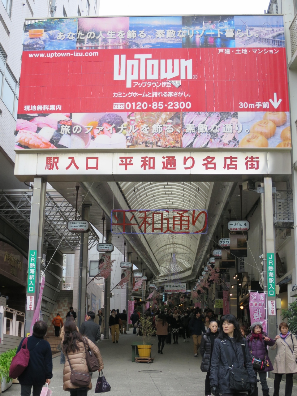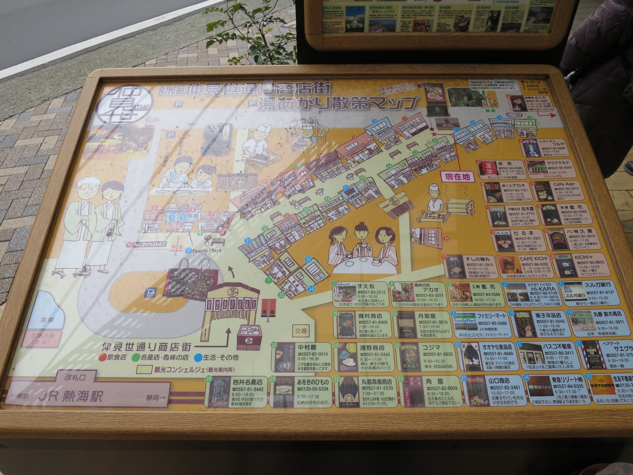熱海駅をロータリー側に出て右手に進んだ所に2つ並んであるアーケード商店街の左側の方です。平和通り商店街よりは短く、駅からみて左手に飲食店、右手に土産物屋などの商店が多く並んでします。温泉まんじゅう、干物と書かれたレトロな昭和の雰囲気たっぷりのお店が多く、古き良き温泉地の商店街と言った感じが魅力の商店街です。