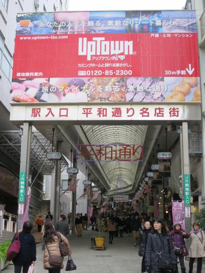 熱海駅をロータリー側に出て右手に進んだ所に2つ並んであるアーケード商店街の右側の法です。仲見世通り商店街より平和通り商店街の方が2倍程の長さがあり、飲食店や商店が多いです。干物店や、土産物点などではその場で食べられるもの売られており、ベンチも用意されているので、食べ歩きが楽しい商店街です。