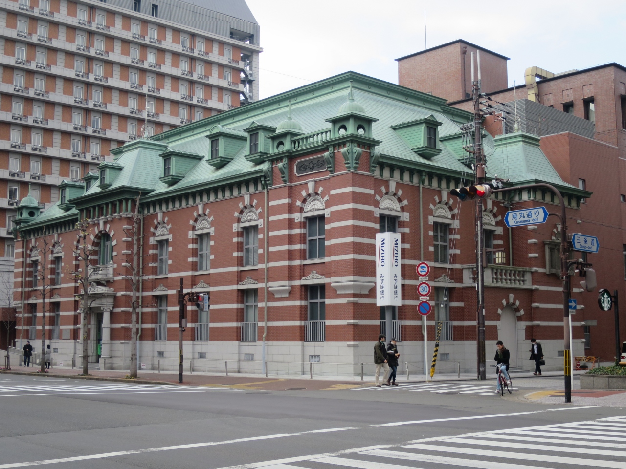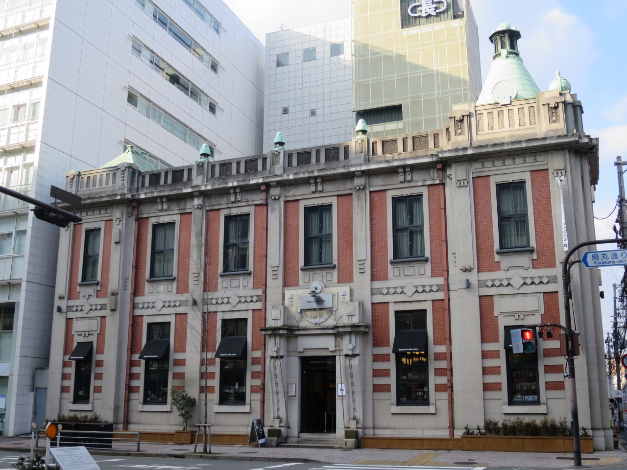 烏丸蛸薬師交差点の南西角にDEAN & DELUCAがあります。高級食材店のカフェですが、今回の目的はDEAN & DELUCAが入るこの建物。大正5年に山口銀行京都支店として建てられた煉瓦造り2階の近代洋風建築で、これも東京駅駅舎で有名な辰野金吾の事務所の作品。どことなく東京駅駅舎に似ています。外壁に施された菱形デザインの意匠がグッドです。