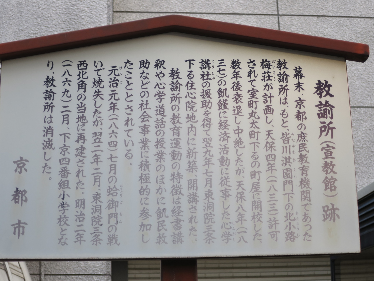 教論所って何だ?と、読んでみると、京都の庶民教育機関であったようで、寺子屋と言った感じの所だった様です。遺構が残っている訳でもなく、駒札だけを見てもどれ位の規模のものだったのか想像も付きません。