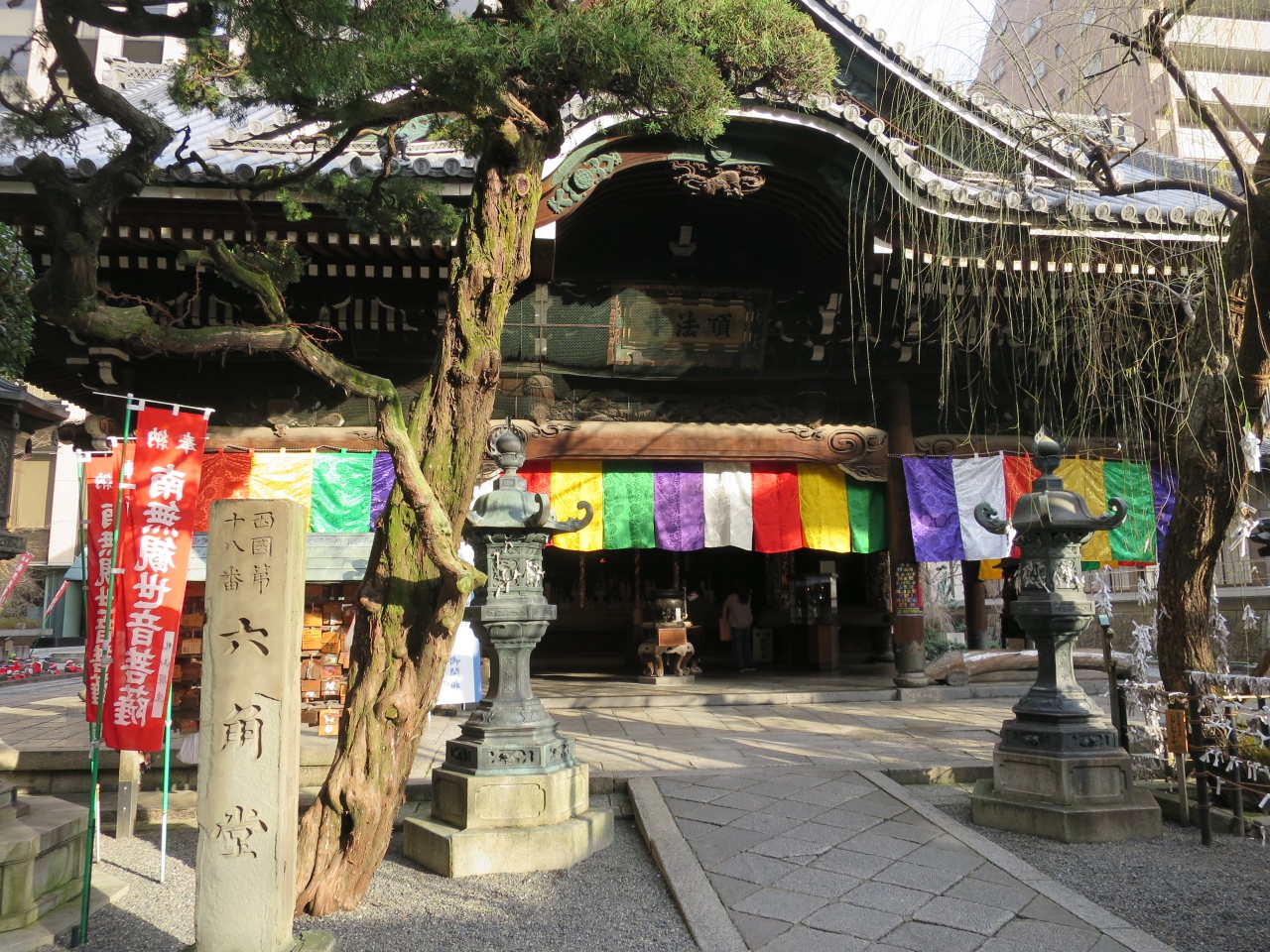 烏丸通りから六角通りを東に入った所に六角堂があります。中庭にお堂が建てられているように、境内がビルに囲まており、こんな所にあるのと思う程、新旧がアンマッチしているのが面白いです。