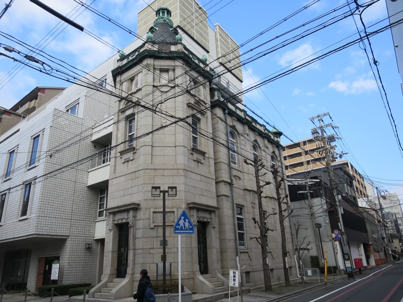 京都 三条通地区は明治から昭和初期にかけて建てられた近代洋風建築が多くあり日本生命京都三条ビルもその一つです。三条柳馬場の交差点の北西角に面した建物は大正3年築。石造りの様に見えますが、煉瓦造りの石貼り。東京駅駅舎の設計で有名な辰野金吾事務所の設計ですが、煉瓦造りの様に見えないのでちょっと違和感を感じました。