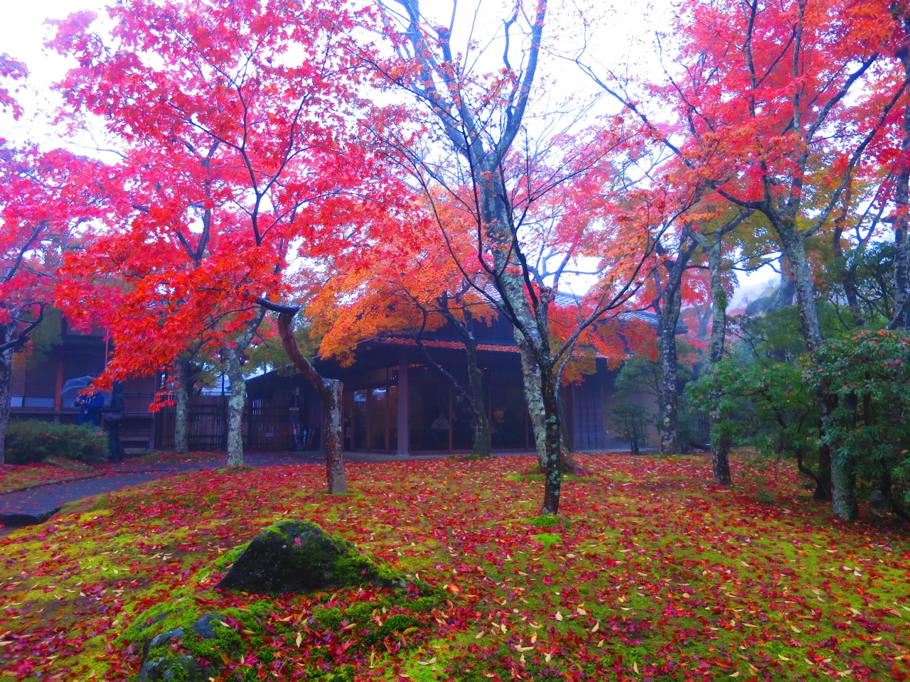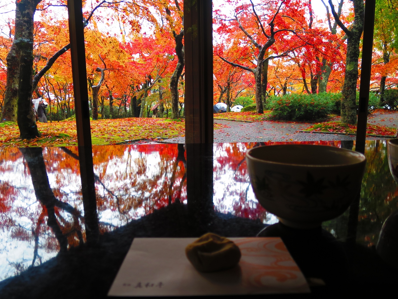ここは兎に角、庭園の紅葉が綺麗に見えるところで、美術館のポスターにも使われているほどです。入場券とお茶席がセットのチケットを買い入りました。出てきたお菓子は栗金団。また、お点前は紅葉が描かれた器。漆の塗られたテーブルに映る庭園の紅葉は絶景です。