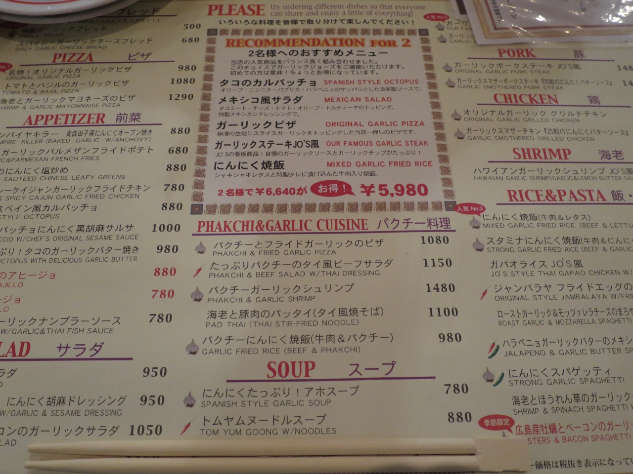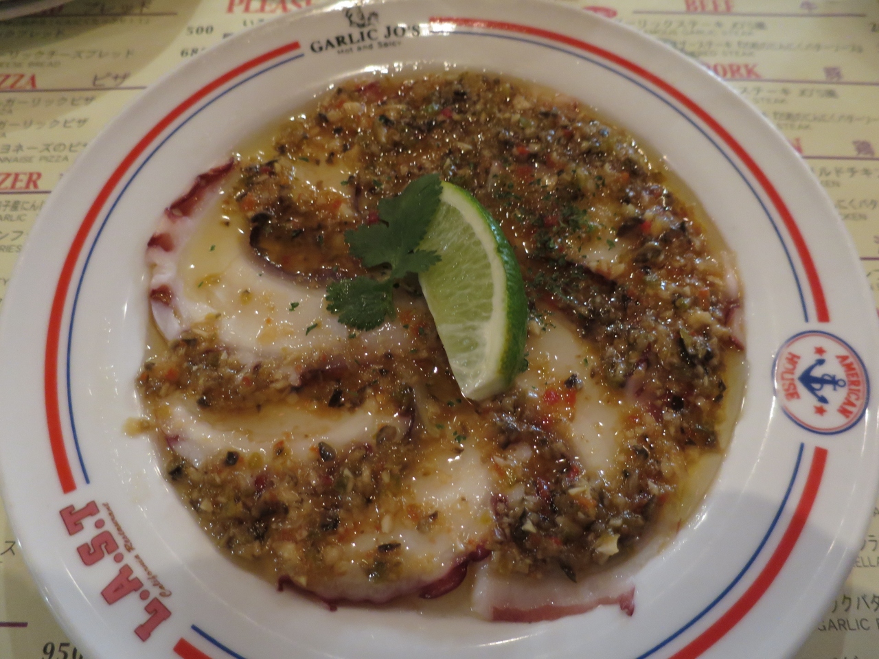 南町田駅の改札を出てすぐ右手にある、その名の通りニンニクを使った料理お店です。映画を見に行ったときに利用しました。注文したのは2名お奨めのメニュー(タコのカルパッチョ、メキシコ風サラダ、ガーリックピザ、ガーリックステーキ、にんにく焼飯)。このメニューはバラで同じメニューを頼むより660円安く、映画の半券があるとソフトドリンクが無料で付けられます。