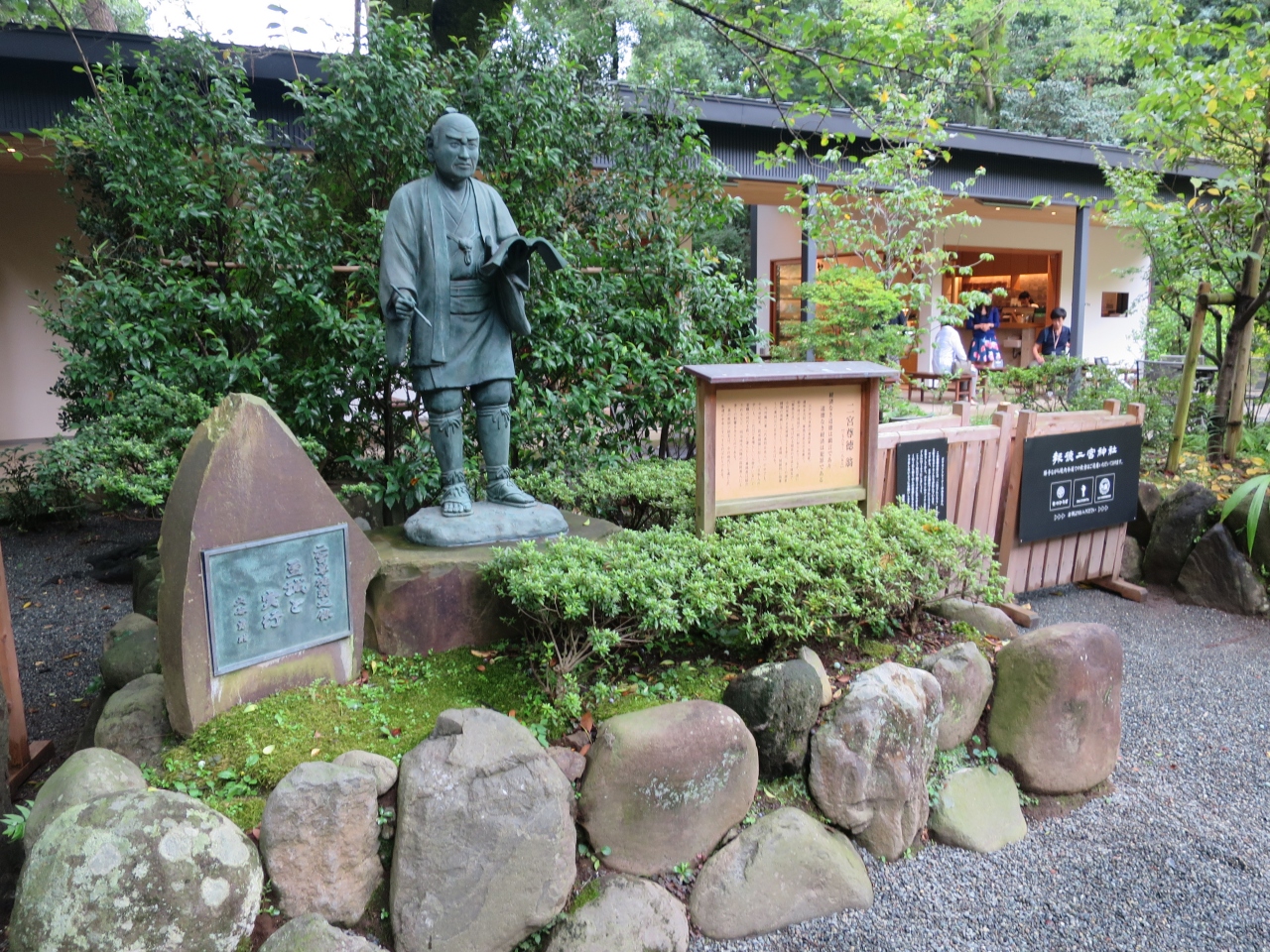 小田原城内にある報徳二宮神社の参道脇にある二宮尊徳翁の銅像です。二宮金次郎の銅像は私の通った学校にもありましたが、少年時代の薪を担いで勉強する像でしたが、こちらの銅像は大人で、検地をしている様な書を書きながら立つ銅像です。大男だったそうですが、こちらの像は小さく。その姿は判りません。
