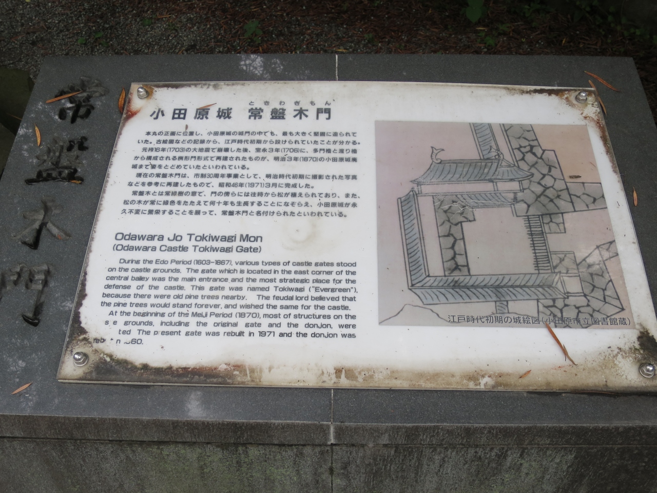 小田原城の本丸正面に立ちかまえる小田原城の正門と言える門です。多聞櫓と渡り櫓からなる防御施設、桝形を形成する構えとなっています。現在の常盤木門は昭和46年に再建されて物で往時の物ではありませんが、その姿はとても立派で、この門を潜った先に見える天守が見事です。門の傍らに松の木が植わっていますが、この門の名前はここからきているそうです。