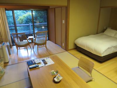 湯河原温泉の山間に佇む静かな温泉旅館。今回、離れの露天風呂付き客室に宿泊しました。客室はフロント前の外階段を下った先にありました。露天風呂は客室前のベランダにあり、目の前に広がる緑がとても新鮮。またとても静かに過ごせました。客室は和室を和洋室に変えた様で、床の間の様な所にベッドが置かれてちょっと違和感を感じました。