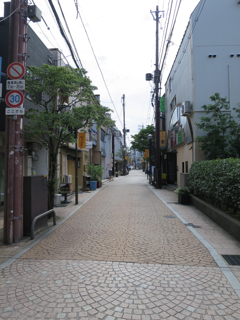 松江大橋北詰から京橋川と並行して伸びる商店街の通りです。