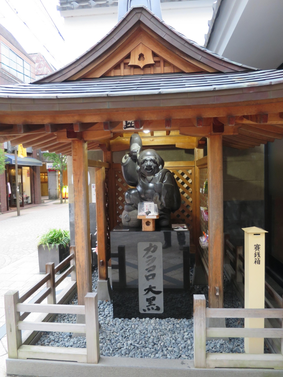 京店通りからカラコロ広場に入る入口の左手に木で出来た祠があり、その中にカラコロ大黒が祀られています。大黒様は願い事を叶えてくれることから、カラコロ大黒のお腹は沢山の人に撫でられてピカピカに黒光りしてます。