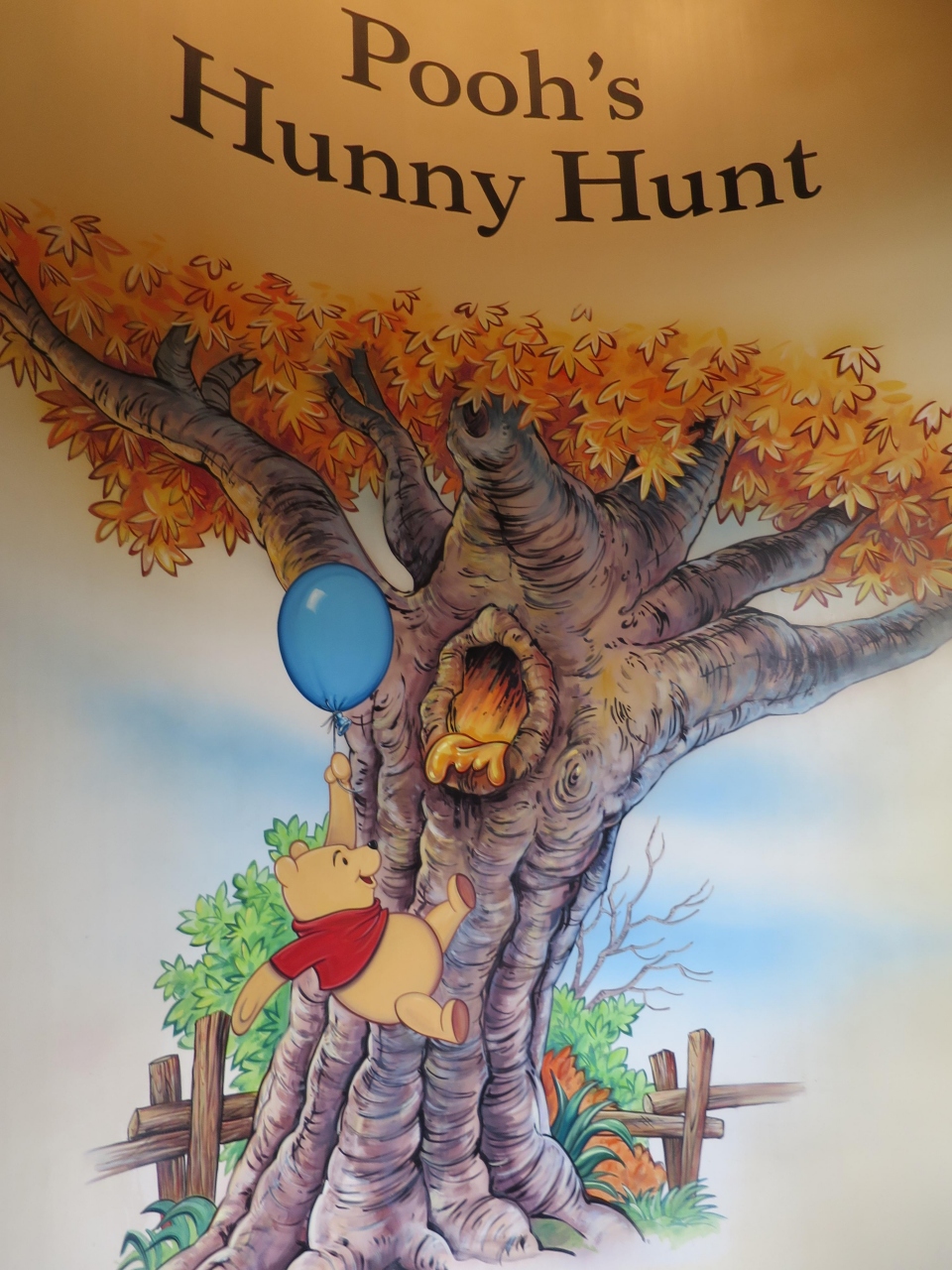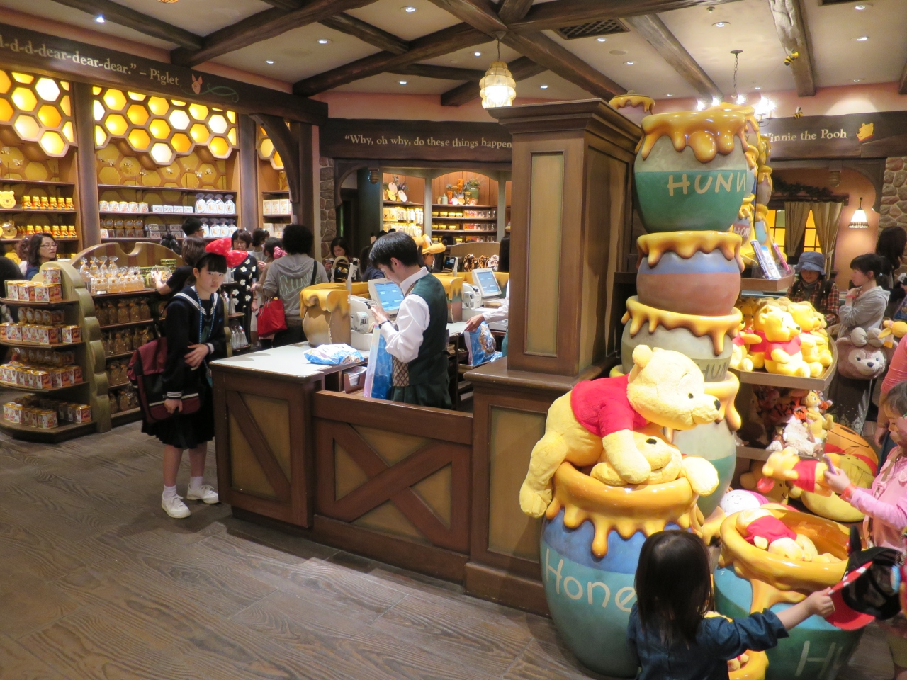 ファンタジーランドにあるプーさんのハニーハントの出口にプーさんコーナーが待ち受けています。アトラクションでプーさんの世界を楽しんで来た後だけに、ぬいぐるみ、マグカップ、キーホルダー等々、プーさんグッズがほぼすべて揃うこのコーナーではつい買ってしまいそうになってしまいます。