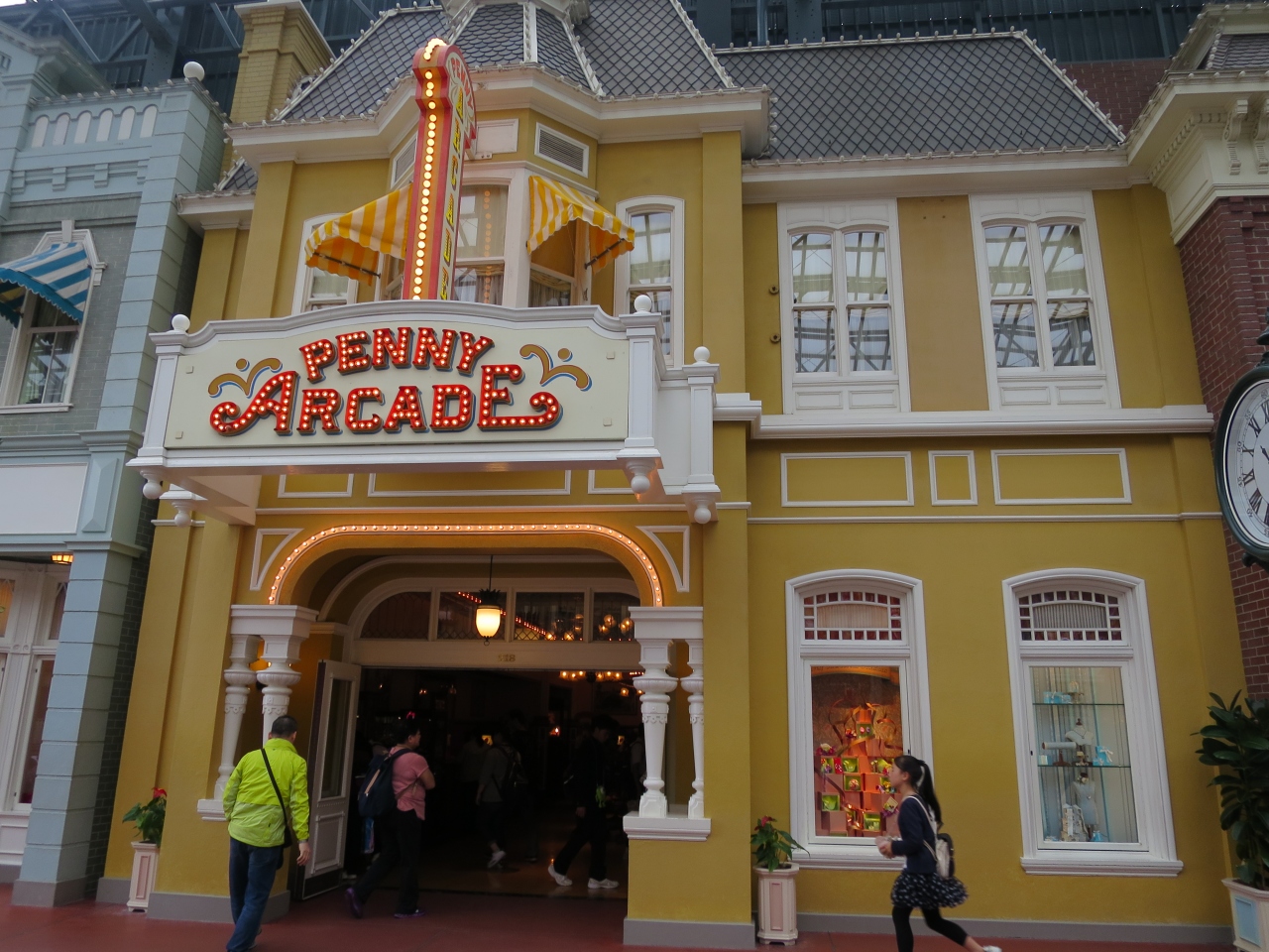 ディズニーランドの正面口にあるワールドバザールを進んだ右手にクラシカルなコインゲームが並ぶペニーアーケードがあります。UFOキャッチャーならぬ、クレーンキャッチャーやピンボール、サッカーゲーム等が勢揃い。どこで集めてきたのか気になります。