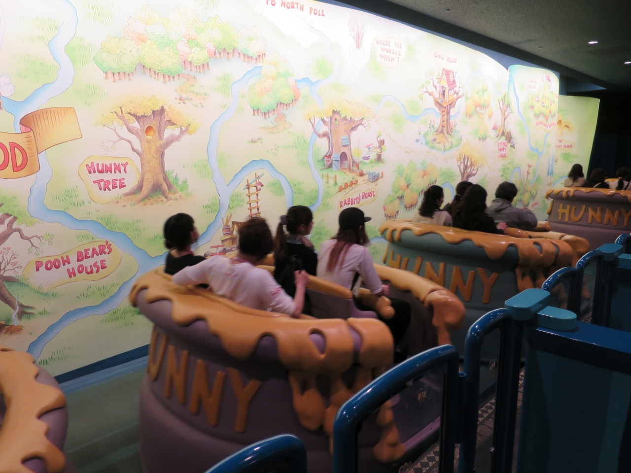 ファンタジーランドでクマのプーさんをモチーフにした一番人気のアトラクションだと思います。ポットに乗る前まではピノキオの冒険旅行と同じ様な物かと想像していましたが、ポットが不規則に動きまわり、何処に進むか予想がつかず楽しくプーさんの世界を堪能できます。
