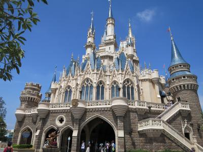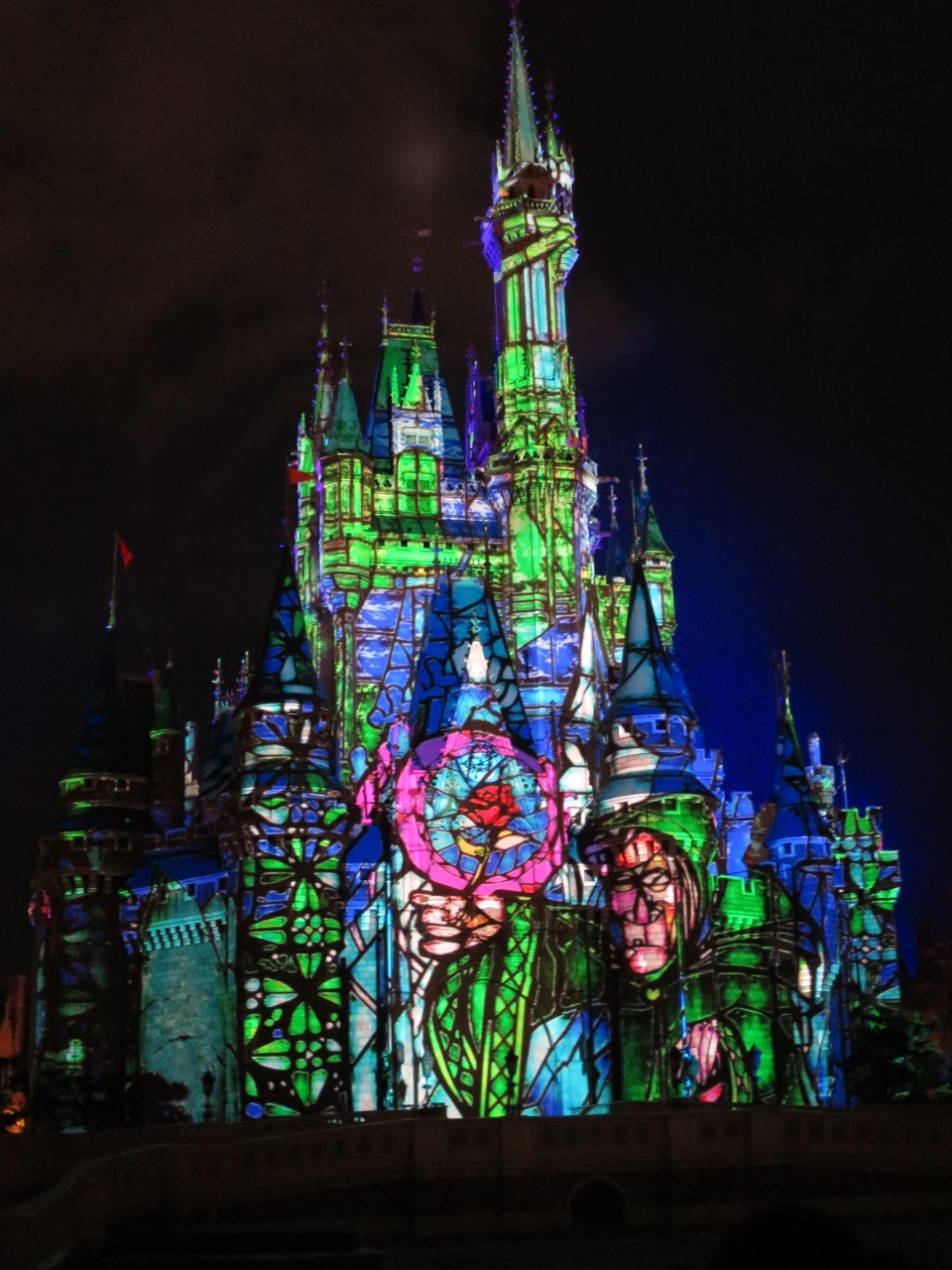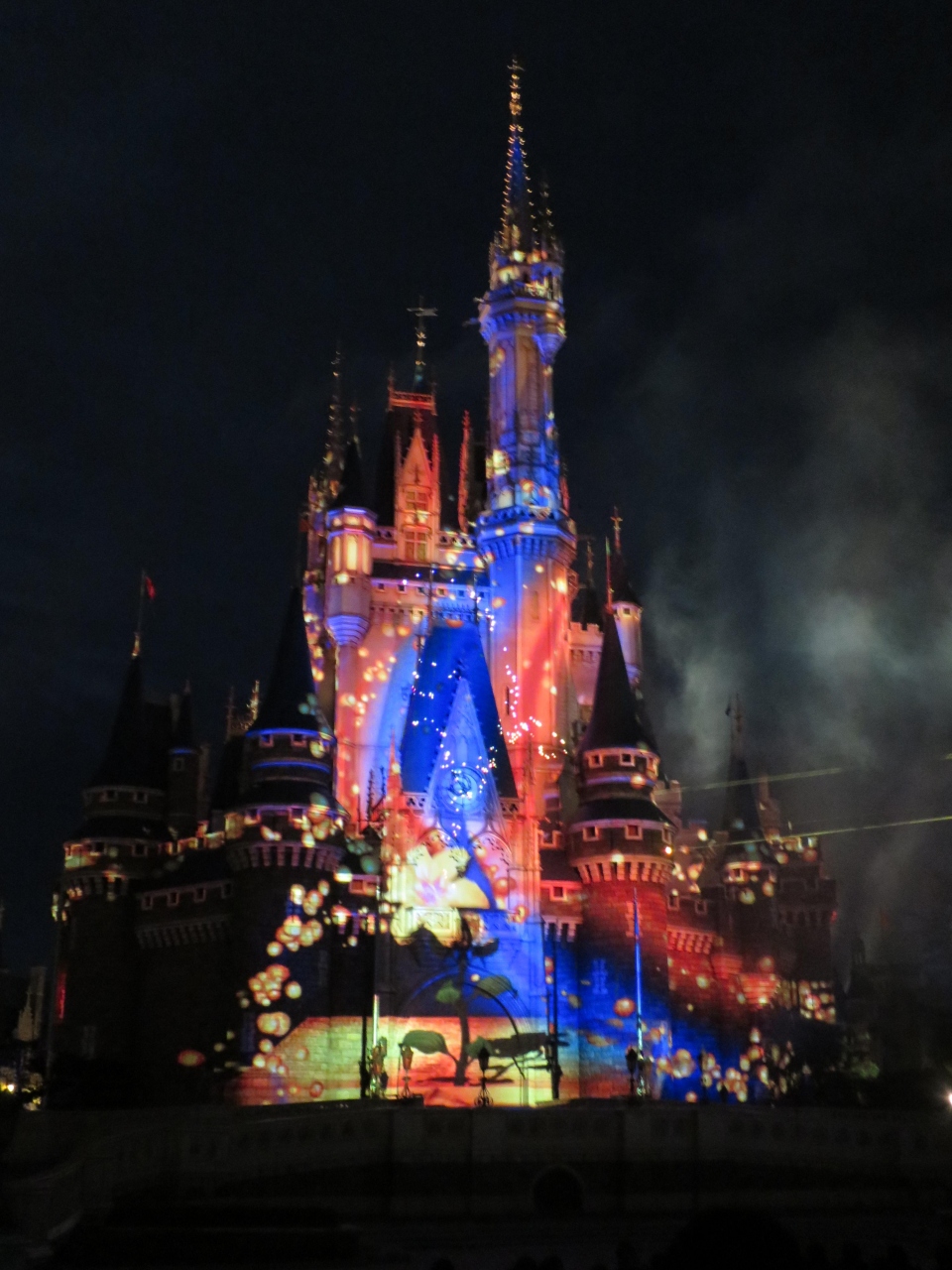 ディズニーランドの象徴的建物であるシンデレラ城をスクリーンにしたプロジェクション・マッピングで、アリス、美女と野獣等の物語が写し出される人気のショーです。通常の混雑具合だと抽選に当たらないと正面で見ることが出来ないのですが、訪れた日はとても空いており、無抽選、早いもの勝ちで見ることが出来ました。とは言っても立ち見で混んでました。