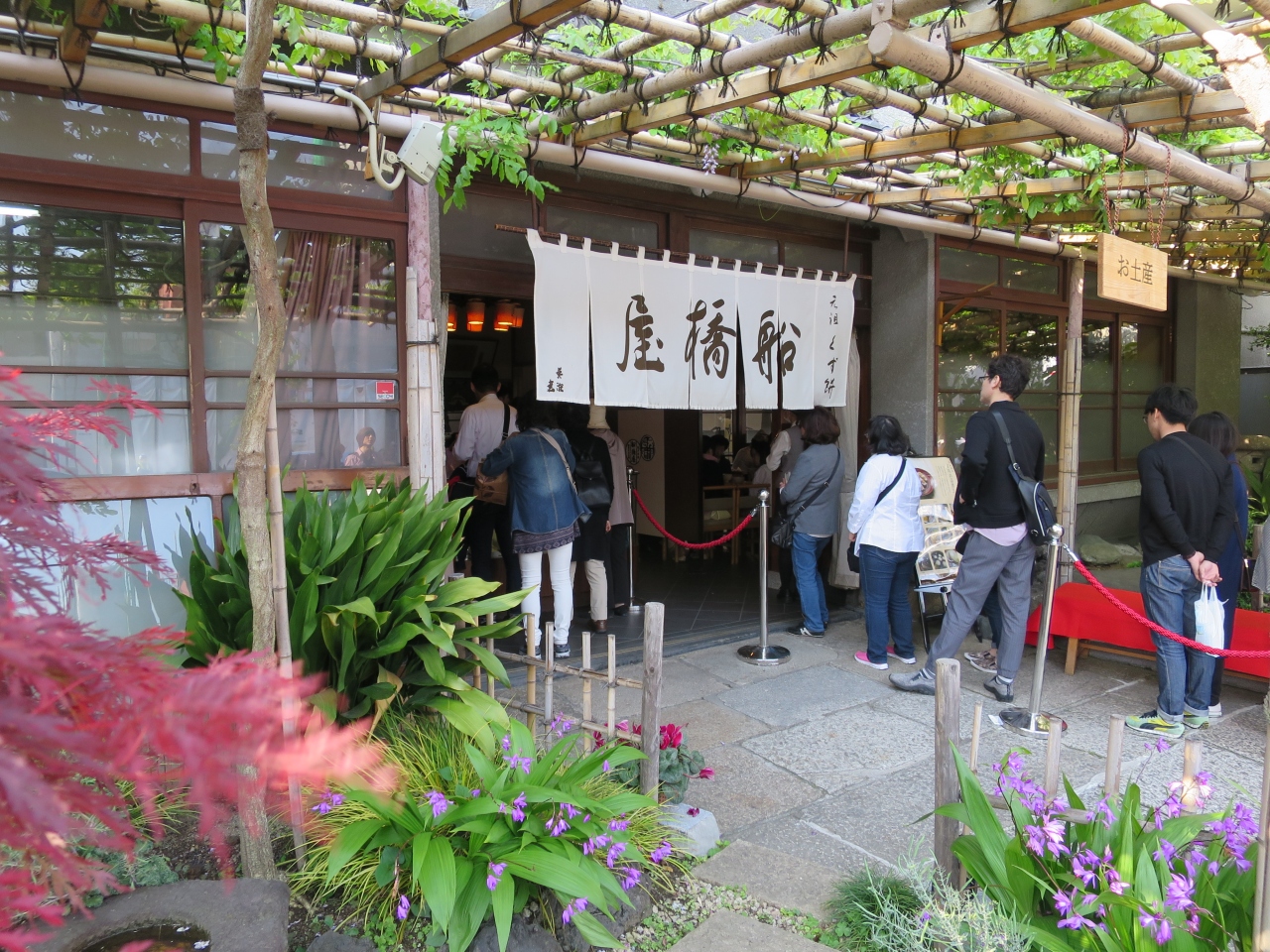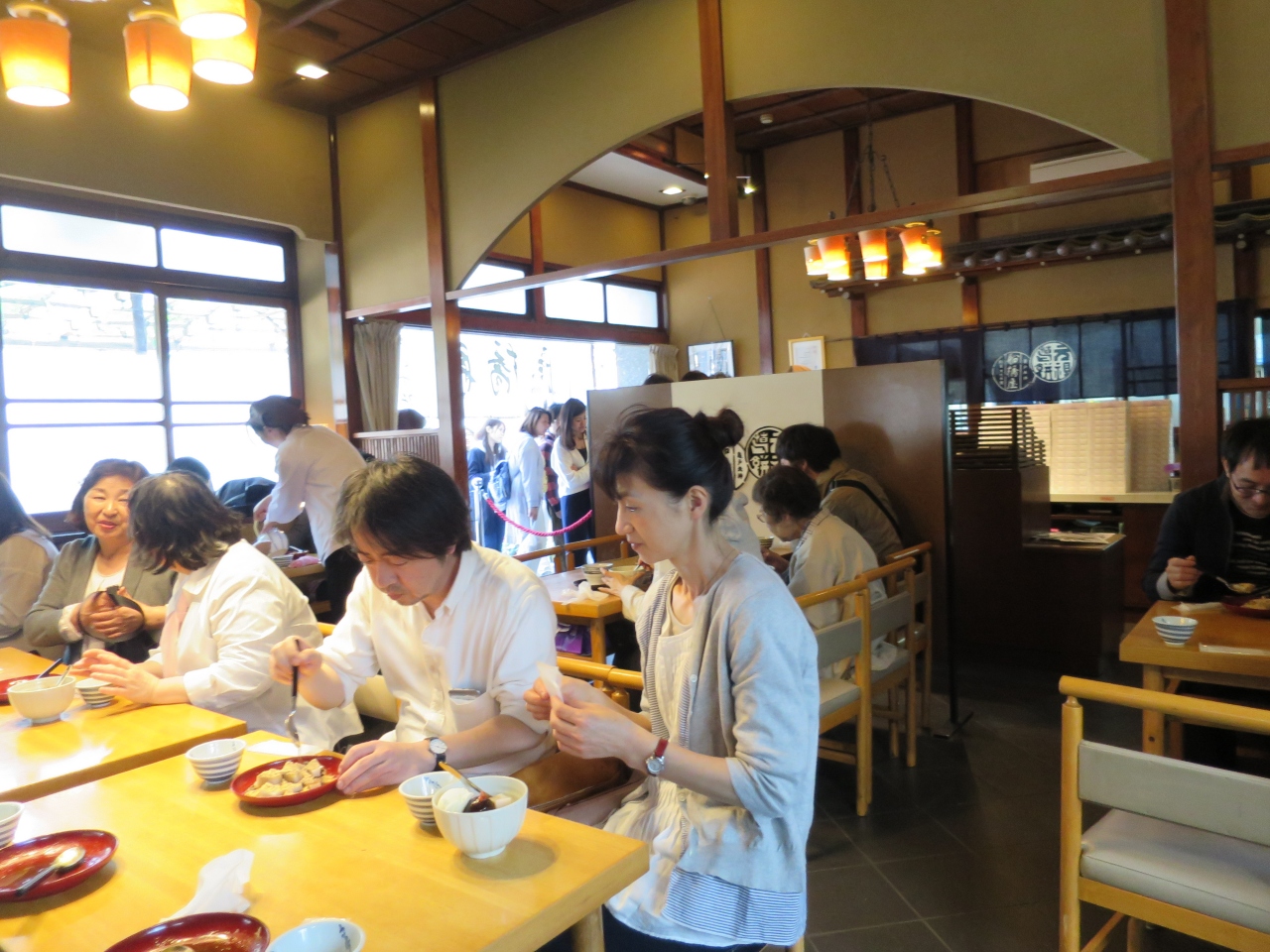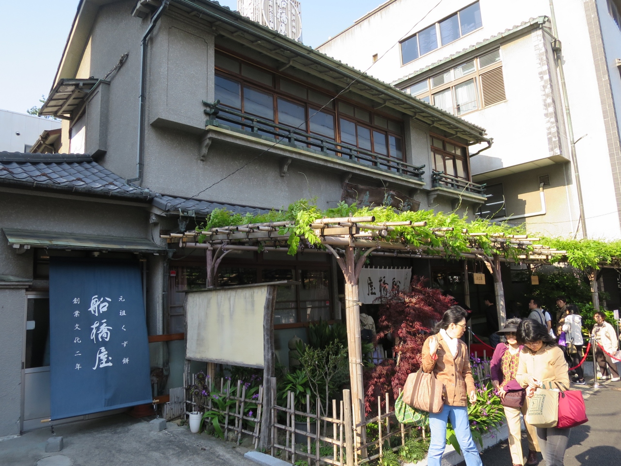 亀戸天満宮の参道入り口左手、蔵前橋通りに面したくず餅の老舗です。亀戸天満宮の藤まつりの時期は店内で食べるのに30分程並ばないと入れません。勿論座席は相席。
