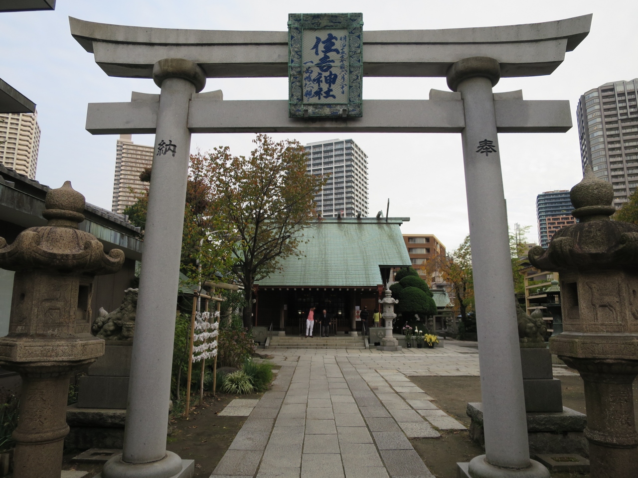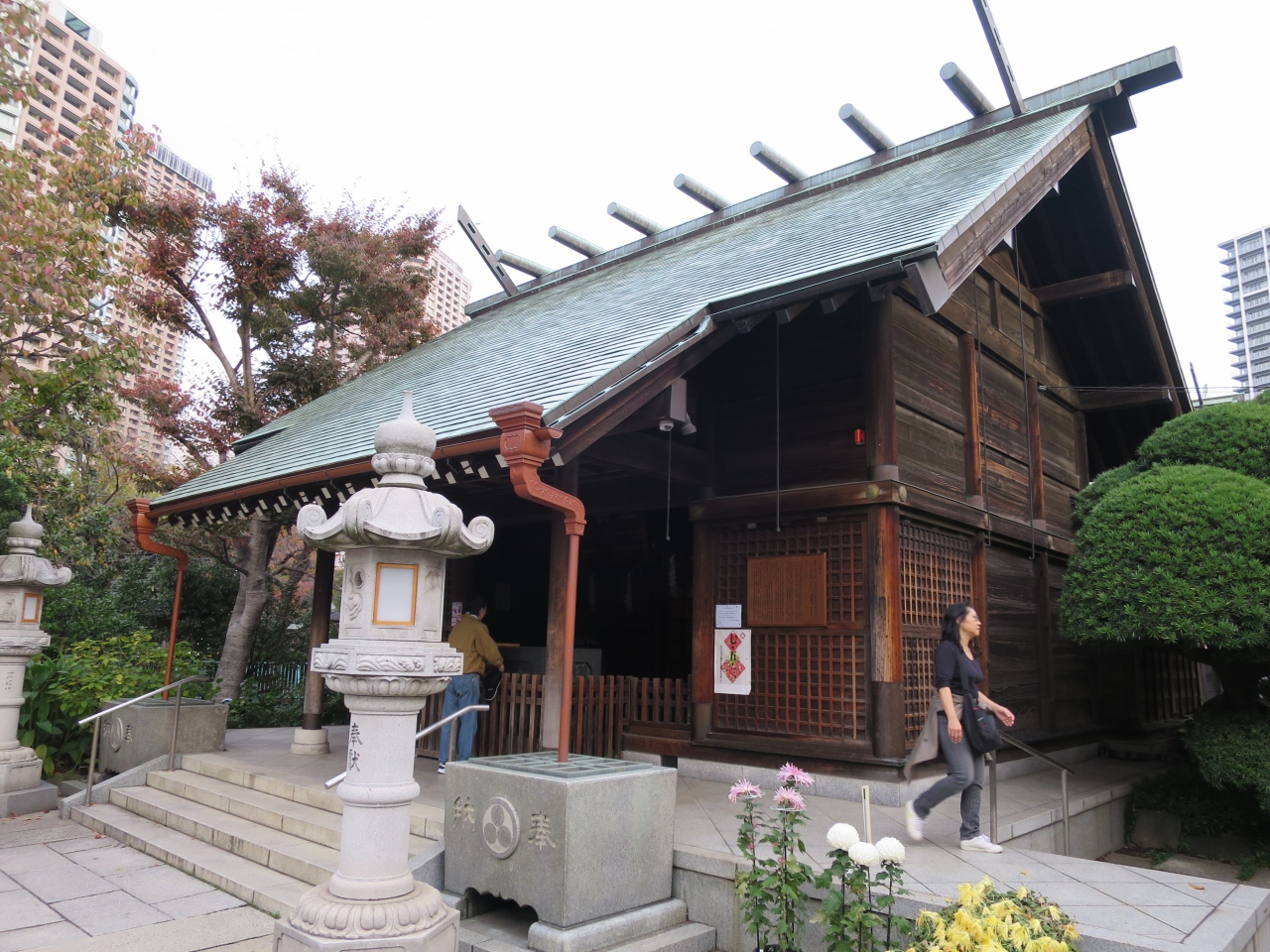 佃島の住吉神社を出て隅田川沿いを3分程北側に歩くと佃公園の堤の上に石川島灯台があります。慶応2年に建てられて船舶用灯台を再現して建てられたもので、大きな常夜燈と言った感じの灯台です。近づいてみると、階下は倉庫の様になっており、近寄ってみても余り意味はありません。