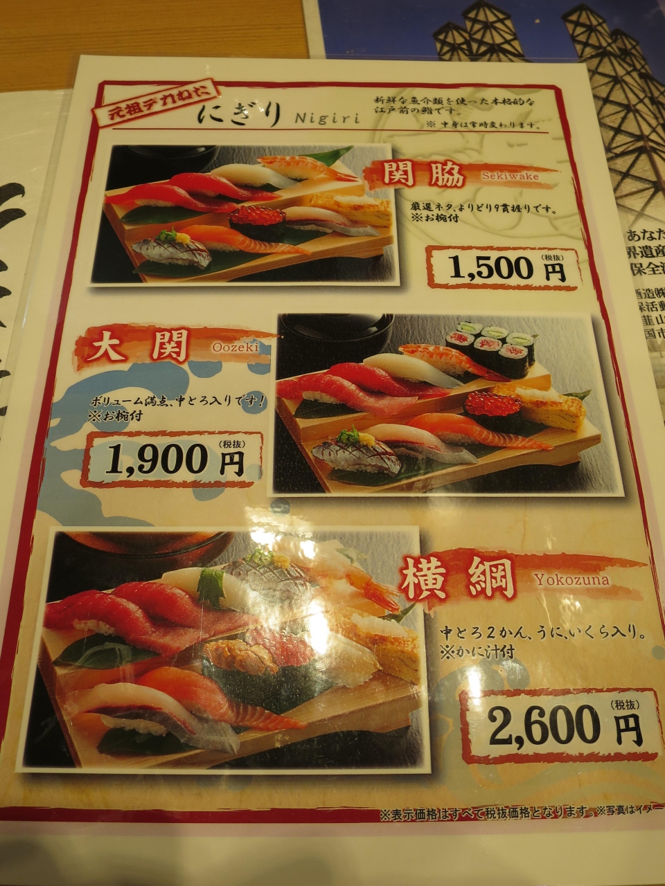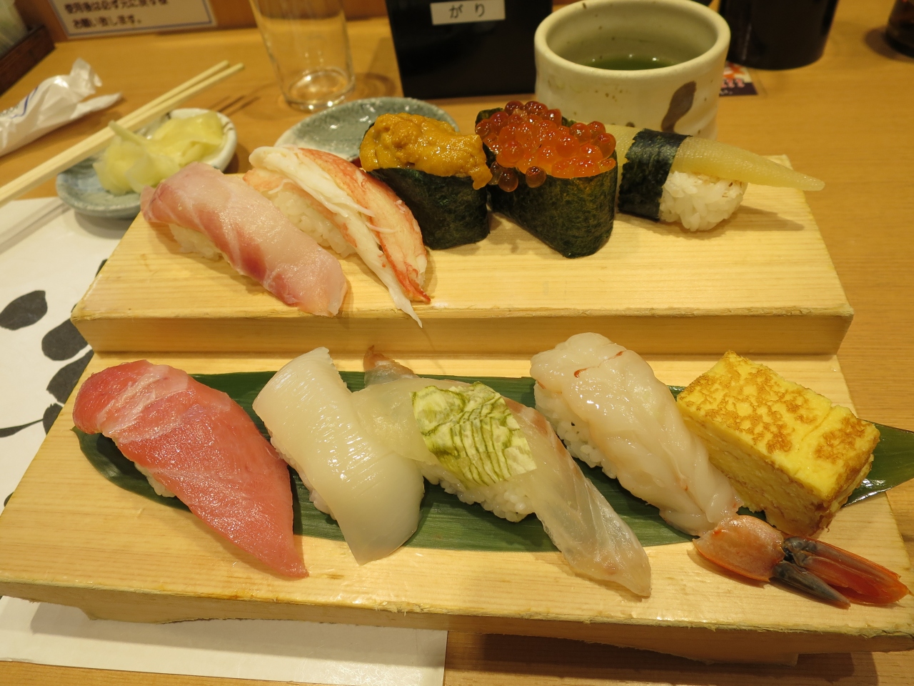 年末だったからなのか、12/30の18:30頃に行くと10組程の待ち。二人だったので30分程待ちカウンター席に通されました。にぎりのセットを頂くと、回転ずしとは違い、ネタの良い寿司が食べられます。- 旅行時期