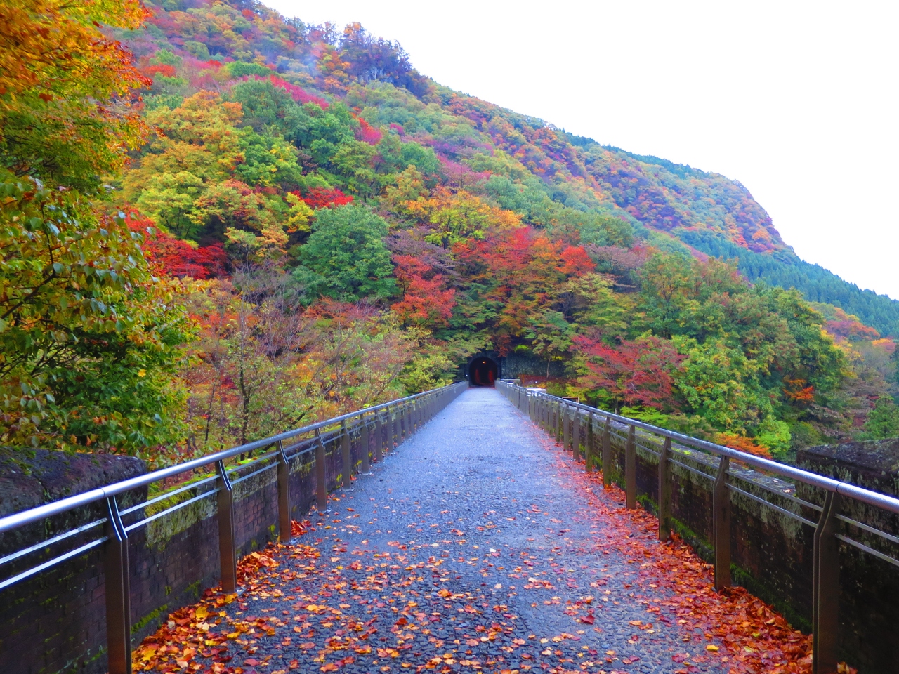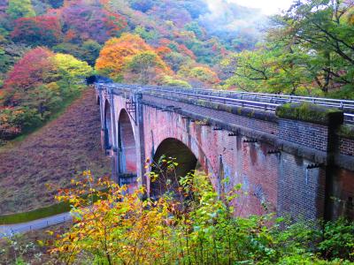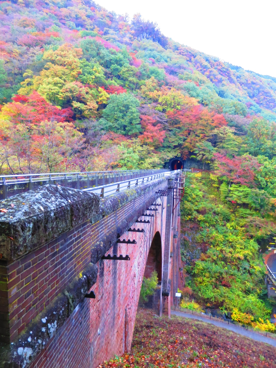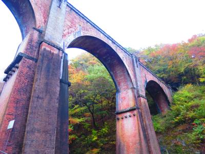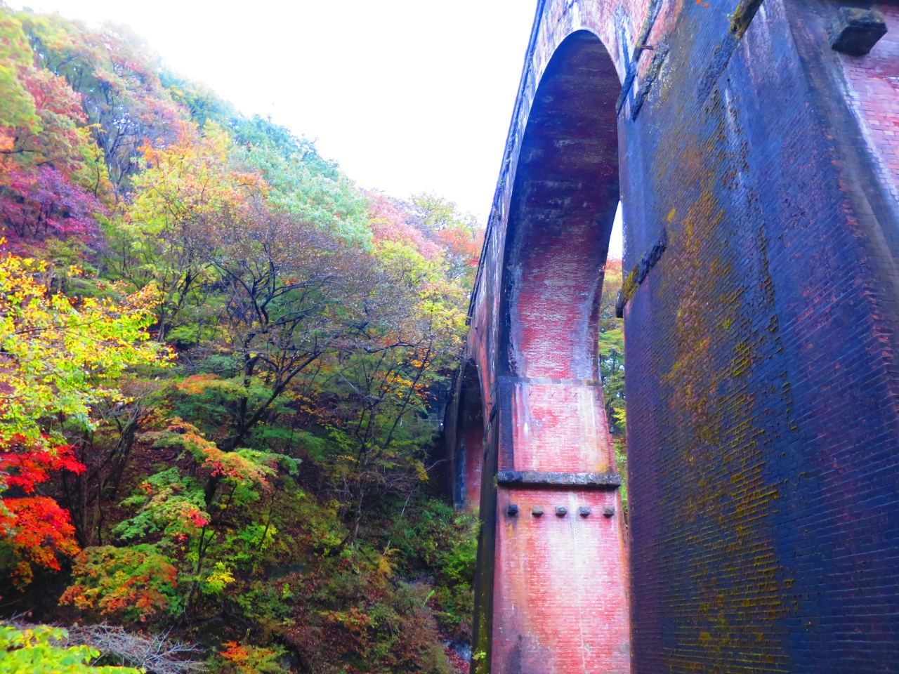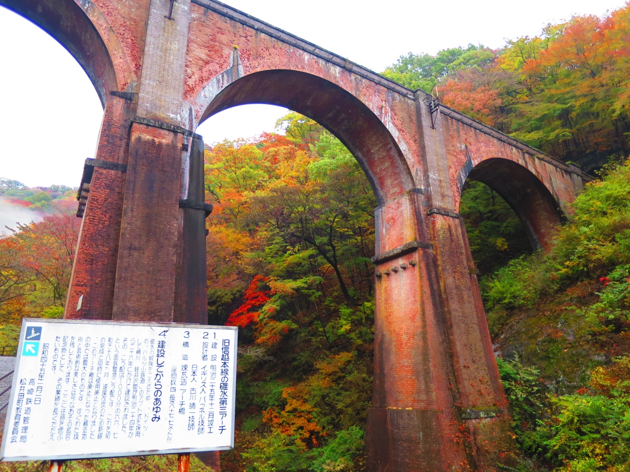 明治25年に完成した旧信越本線を支えた煉瓦造りのアーチ橋です。正式名は碓氷第三橋梁。国道18号線の旧道を上って行くと右手にあります。丁度紅葉の時期で、紅葉に溶け込んだめがね橋は絶景でした。めがね橋の上からも山深い紅葉の眺めが見られとても綺麗でした。