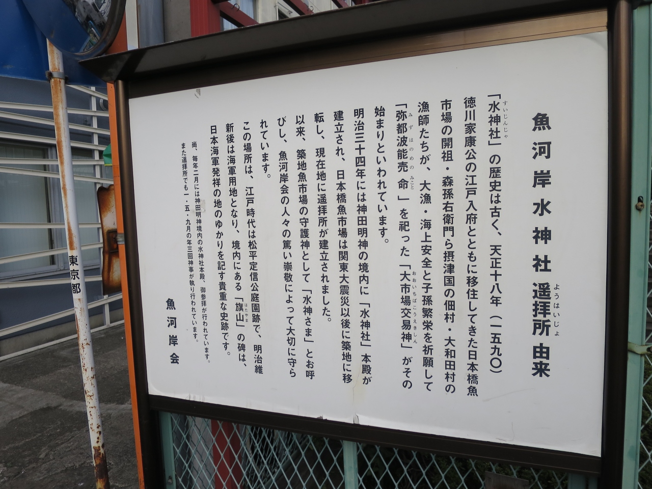 築地場内市場の本願寺寄りの所に魚河岸水神社(遥拝所)があります。遥拝所となっているのは北に離れた神田明神の境内にある水神社本殿を拝む所だからです。築地場内市場はターレー等が行き交い忙しない所ですが、水神社の一角は何故か落ち着きます。