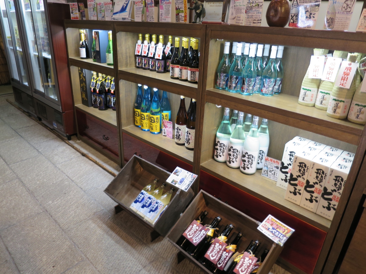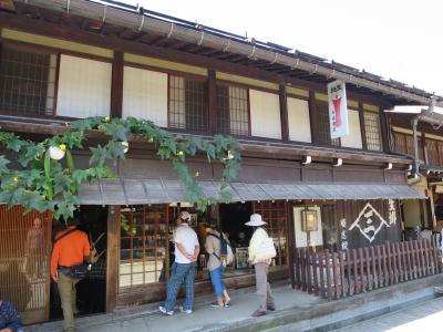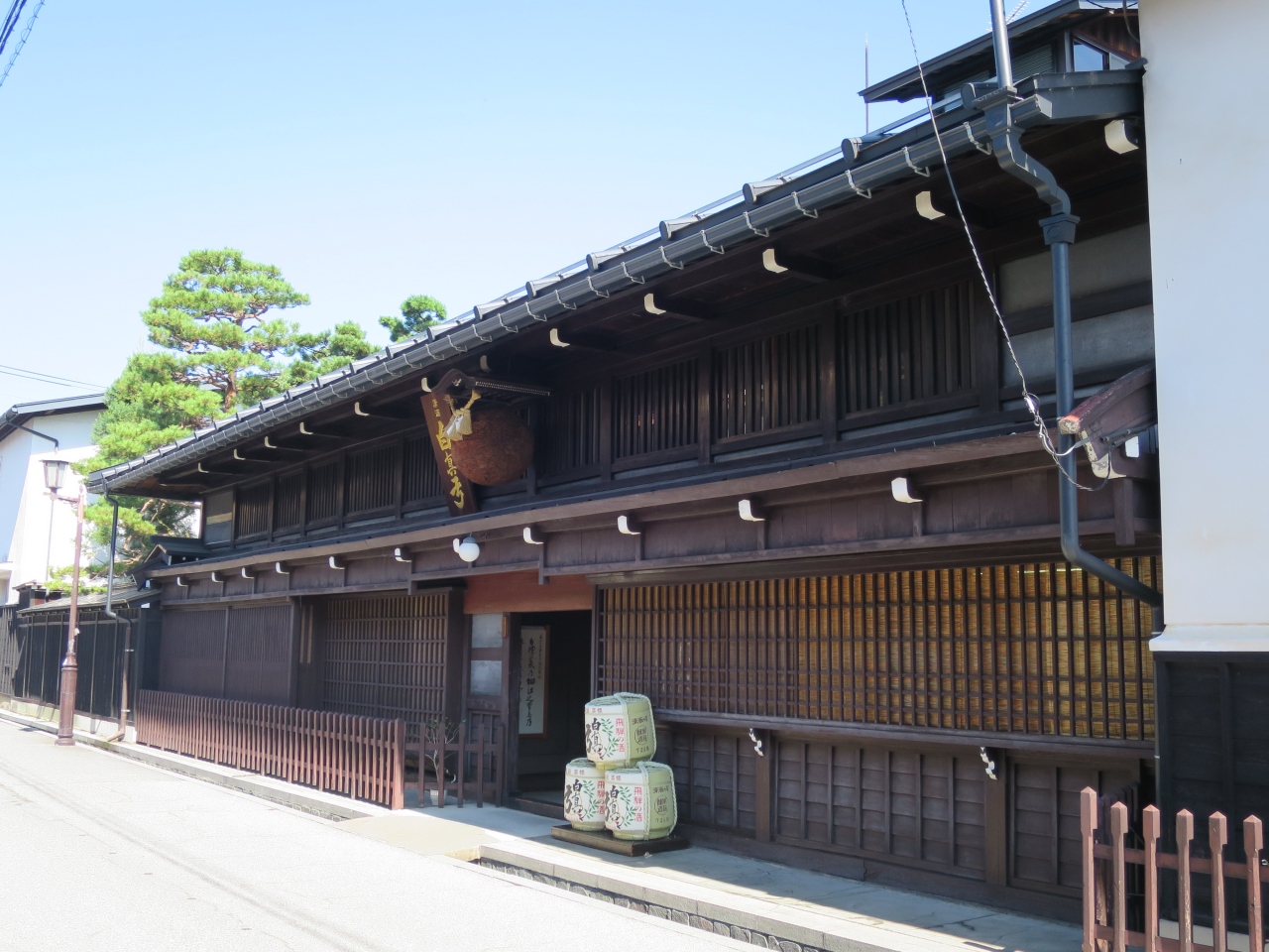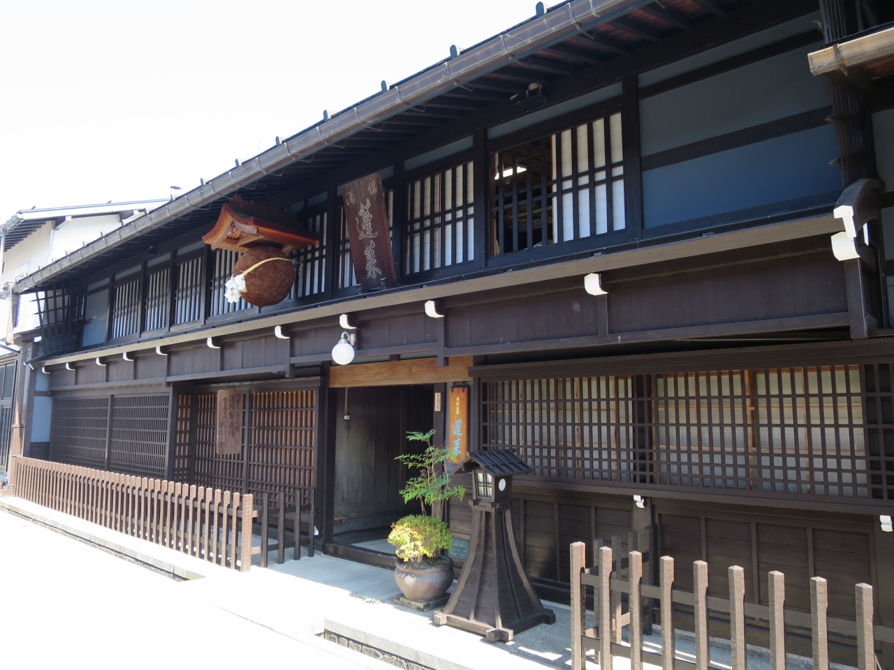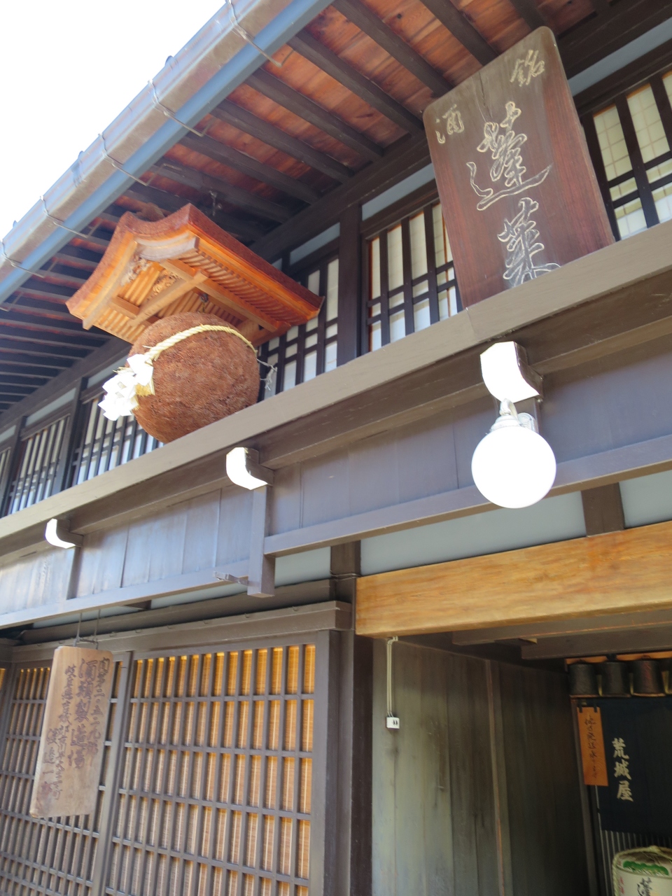 飛騨古川の旧街道沿いに2軒ある老舗地酒酒蔵の一つです。宿泊した旅館で「蓬莱」と言う酒のあらばしりを戴き、買いに行きました。いかにも酒蔵といった感じの建物には酒林(杉玉)が下がり、梁には駕籠がぶら下がっていました。
