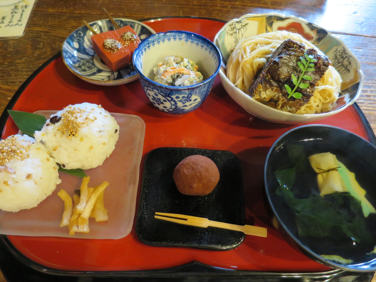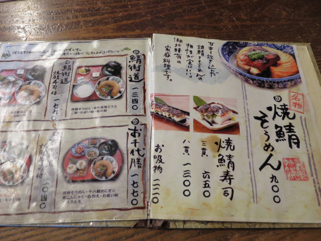 古そうな建物1階奥の座敷に座り鯖そうめんと鯖寿司のお膳を戴きました。煮込んだ鯖と、甘辛い汁のしみ込んだそうめんが絶妙に美味しいです。