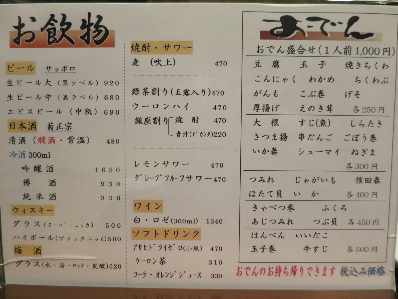 銀座8丁目の並木通りにあるおでんの老舗名店です。秋に入りおでんが食べたくなり、久々に行って来ました。おでんは関東風の醤油仕立てに濃口で、単品(100円~)から頼めますが、盛り合わせ(1000円)がお得です。一緒に茶飯を頼みおでんを乗せて食べると更に美味しいです。メニューはおでん以外にも刺身、揚げ物もあります。